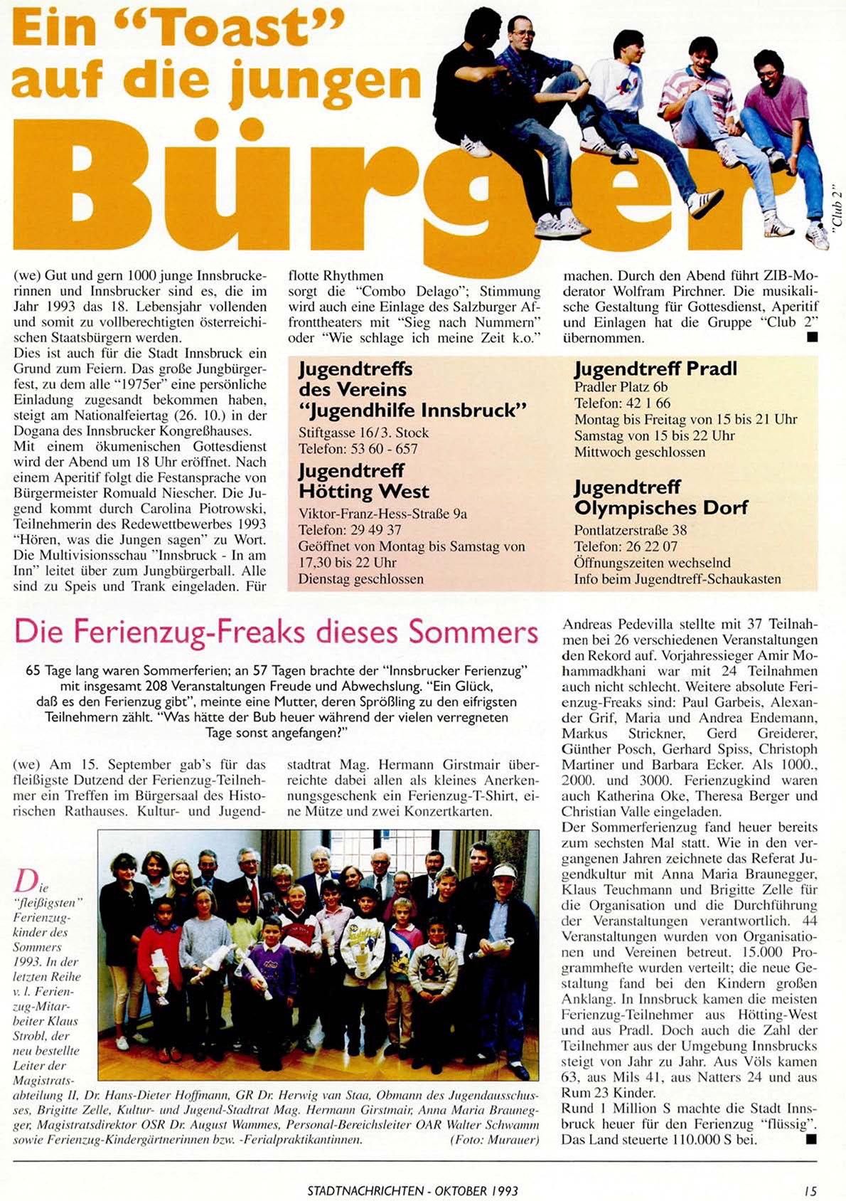 abteilung II, Dr. Hans-Dieter Hoffmann, GR Dr. Herwig van Staa, Obmann des Jugendausschusses, Brigitte Zelle, Kultur- und Jugend-Stadtrat Mag. Hermann Girstmair, Anna Maria Braunegger, Magistratsdirektor OSR Dr. August Wammes, Personal-Bereichsleiter OAR Walter Schwamm