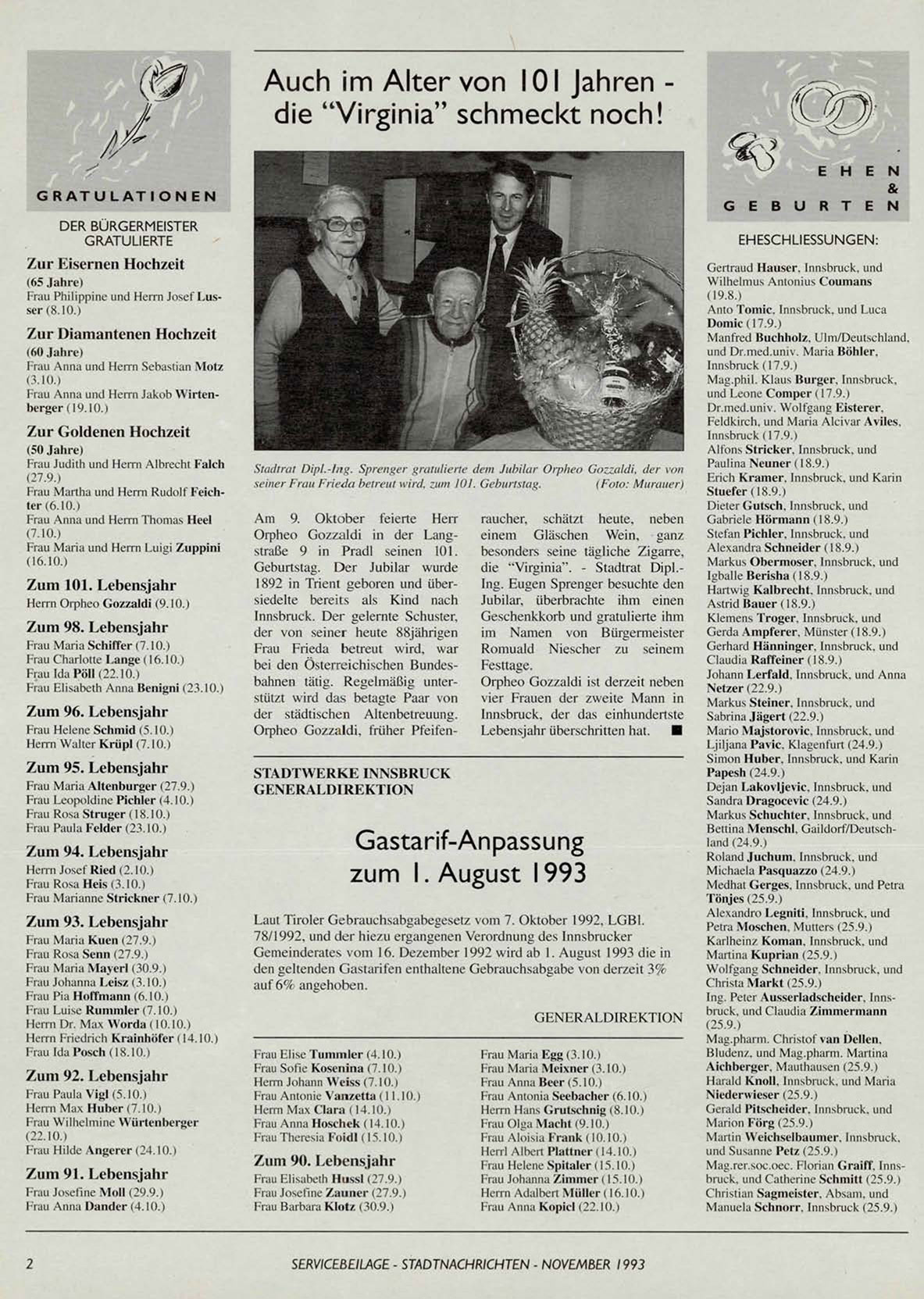 Orpheo Gozzaldi in der Langstraße 9 in Pradl seinen 101.