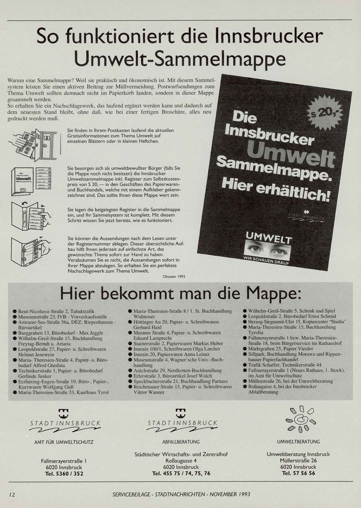 Umweltsammelmappe inkl. Register zum Selbstkostenpreis von S 20,— in den Geschäften des Papierwarenund Buchhandels, welche mit einem Aufkleber gekennzeichnet sind. Das sollte Ihnen diese Mappe wert sein.