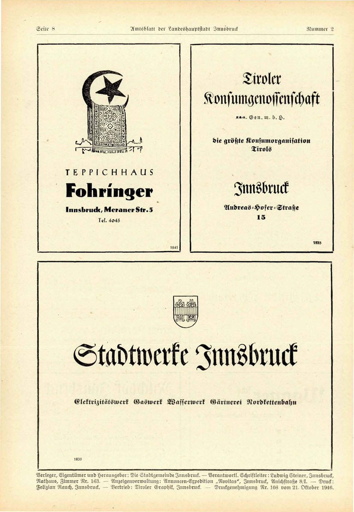 Verleger, Eigentümer und Herausgeber: Die «^tadtgemeiude Innsbruck. - Verantwortl. Schriftleiter ". Ludwig kleiner, Innsbruck,