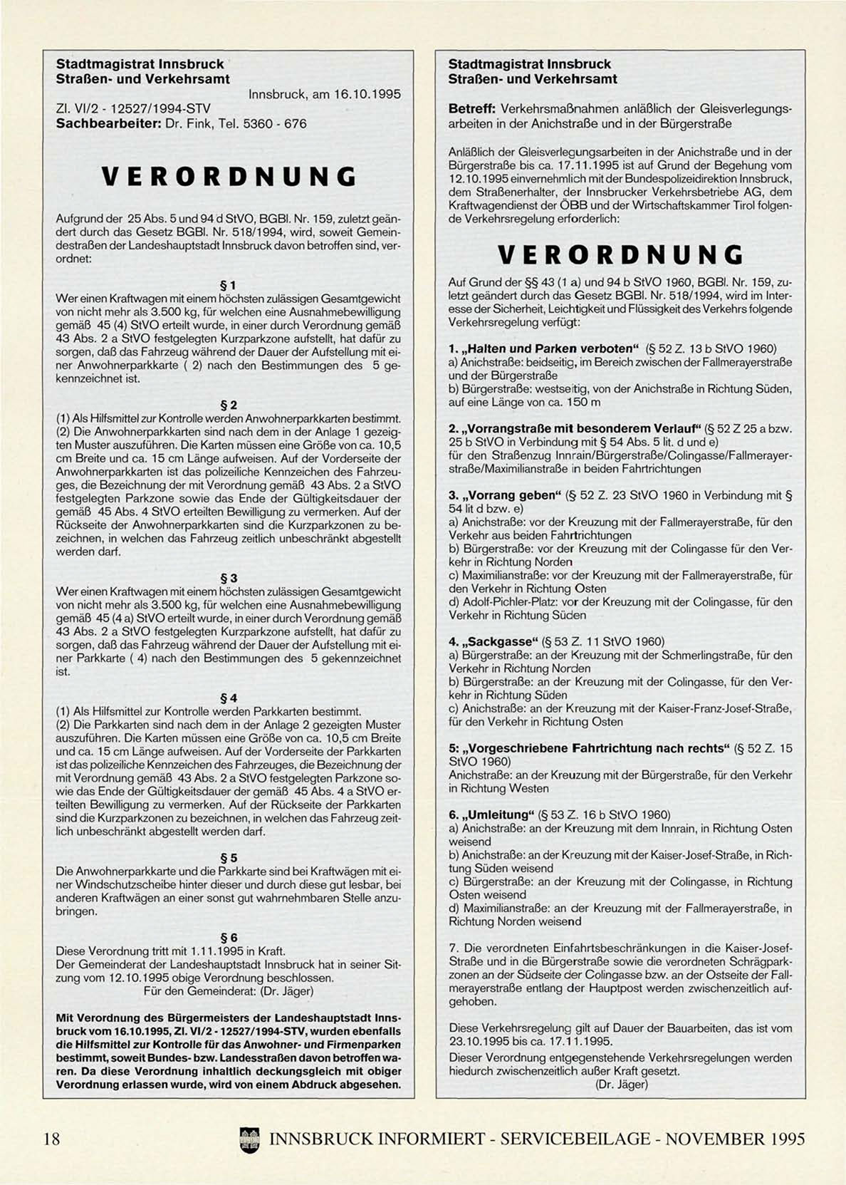 Mit Verordnung des Bürgermeisters der Landeshauptstadt Innsbruck vom 16.10.1995, ZI. VI/2 -12527/1994-STV, wurden ebenfalls
