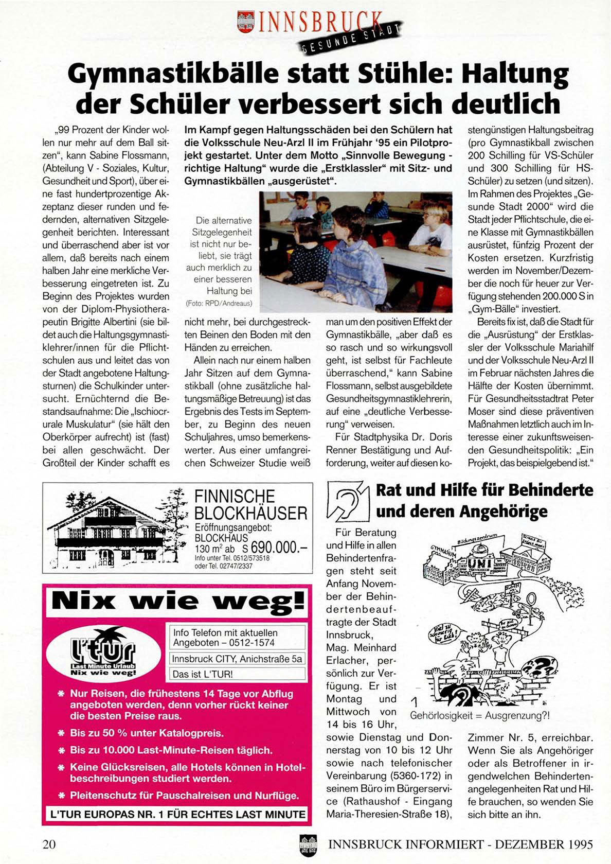 die Volksschule Neu-Arzl II im Frühjahr "95 ein Pilotprojekt gestartet. Unter dem Motto „Sinnvolle Bewegung richtige Haltung" wurde die „Erstklässler" mit Sitz- und
