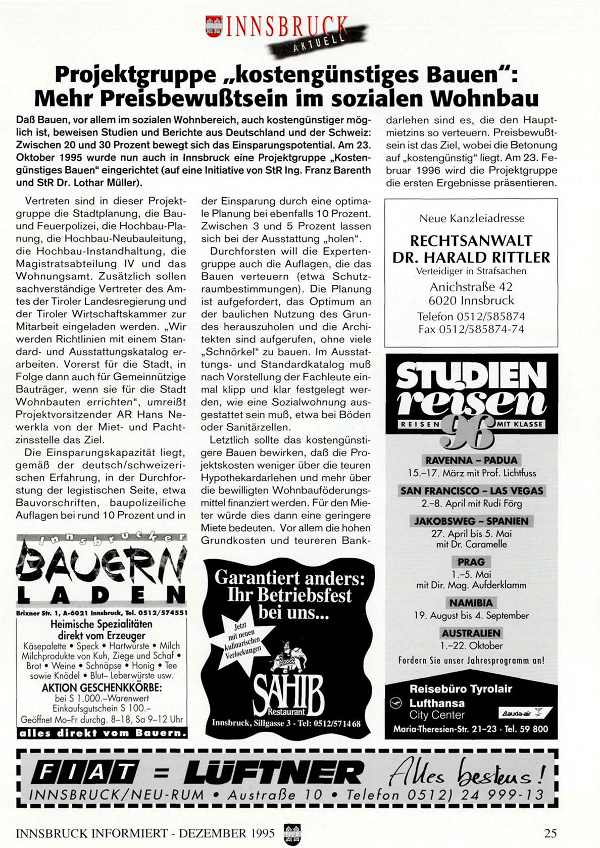 Oktober 1995 wurde nun auch in Innsbruck eine Projektgruppe „Kostengünstiges Bauen" eingerichtet (auf eine Initiative von StR Ing. Franz Barenth