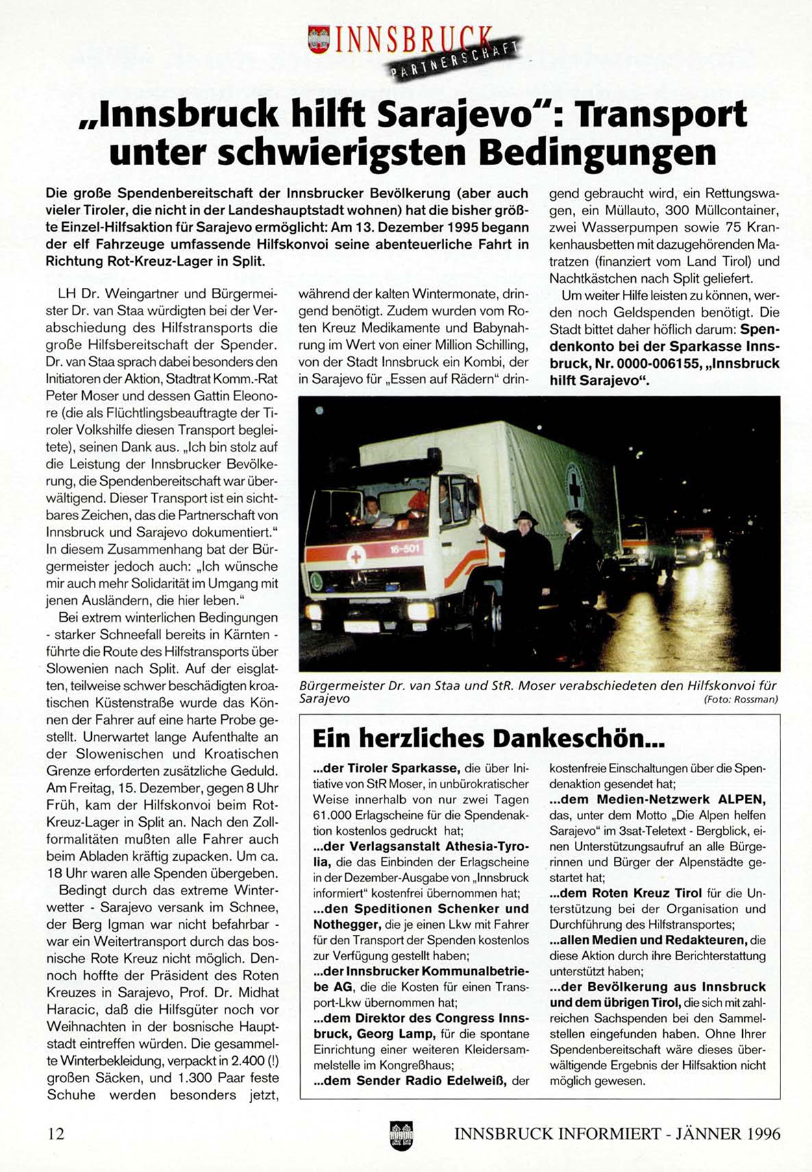 vieler Tiroler, die nicht in der Landeshauptstadt wohnen) hat die bisher größte Einzel-Hilfsaktion für Sarajevo ermöglicht: Am 13. Dezember 1995 begann