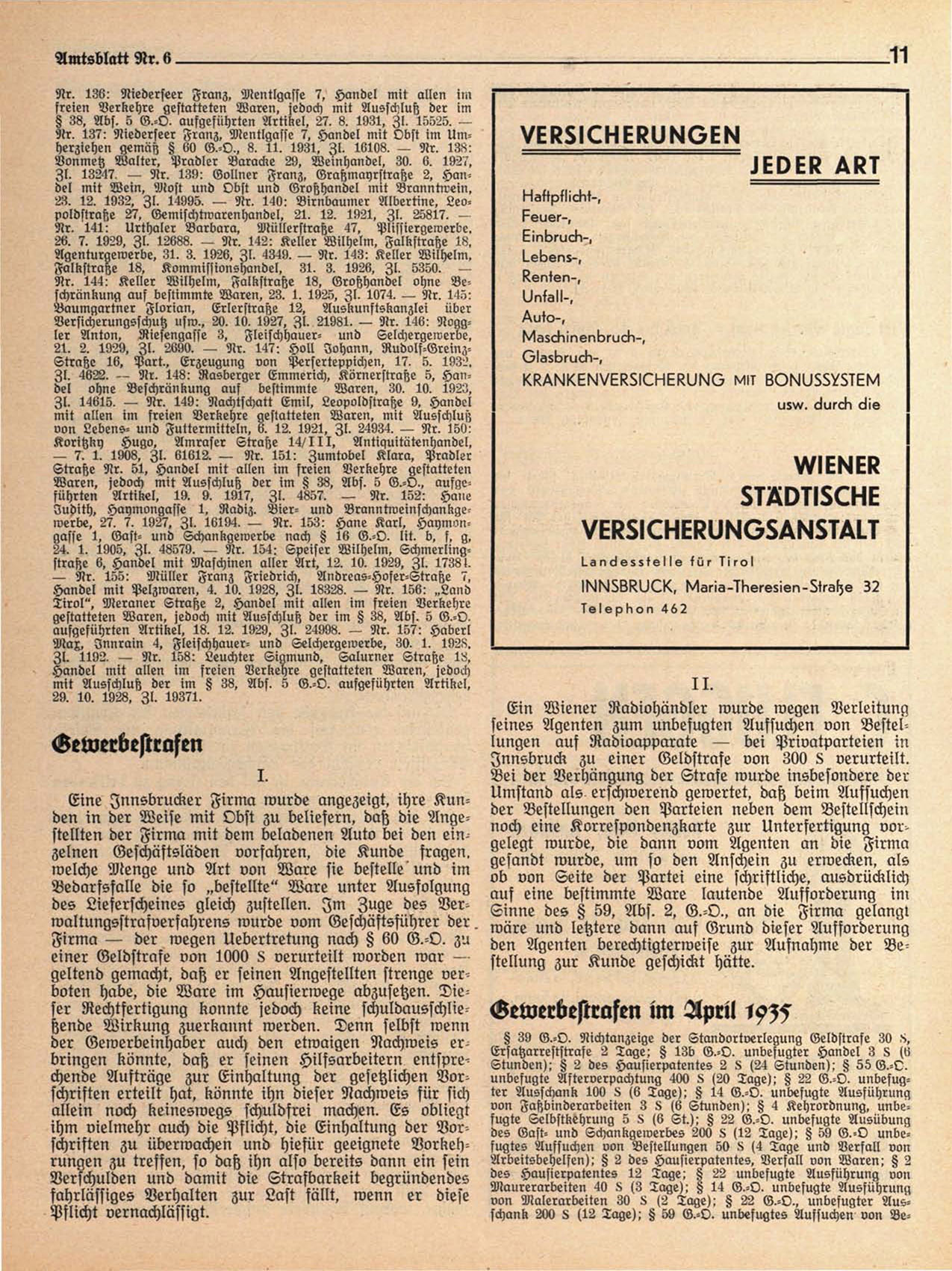 § 38. Abs. 5 G.-O. aufgeführten Artikel. 27. 8. 1931, ZI. 15525. Nr. 137: Niederseer Franz, Mentlgasse 7. Handel mit Obst im Umherziehen gemäß § 60 G.-O.. 8. 11. 1931. I I . 16108. — Nr. 138: