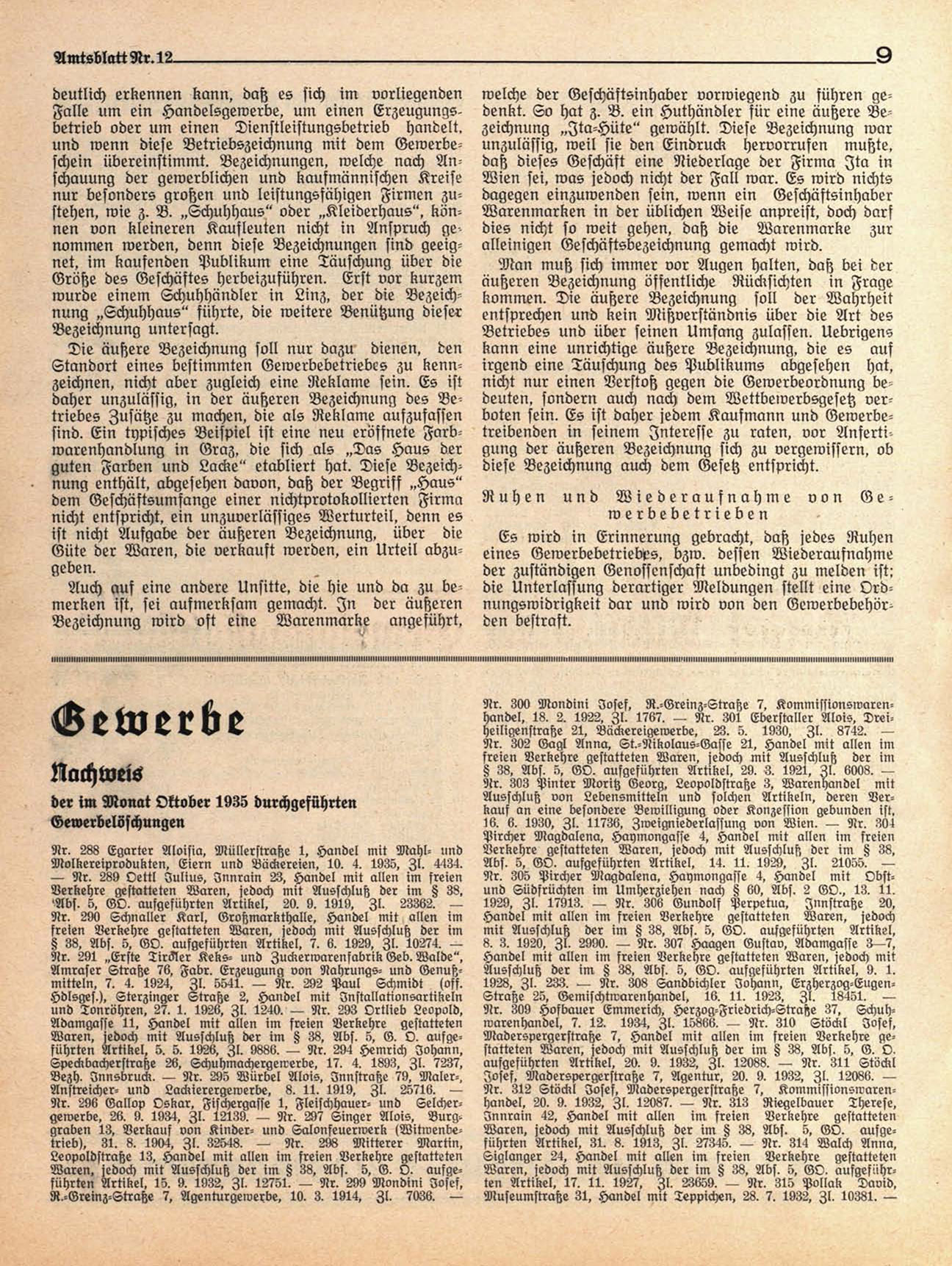 Nr. 300 Mondini Josef, R.-Greinz-Straße 7, Kommissionswarenhandel. 18. 2. 1922. Zl. 1767. — Nr. 301 Eberstaller Alois. Dreiheiligenstraße 21. Väckereigewerbe. 23. 5. 1930. Zl. 8742. —