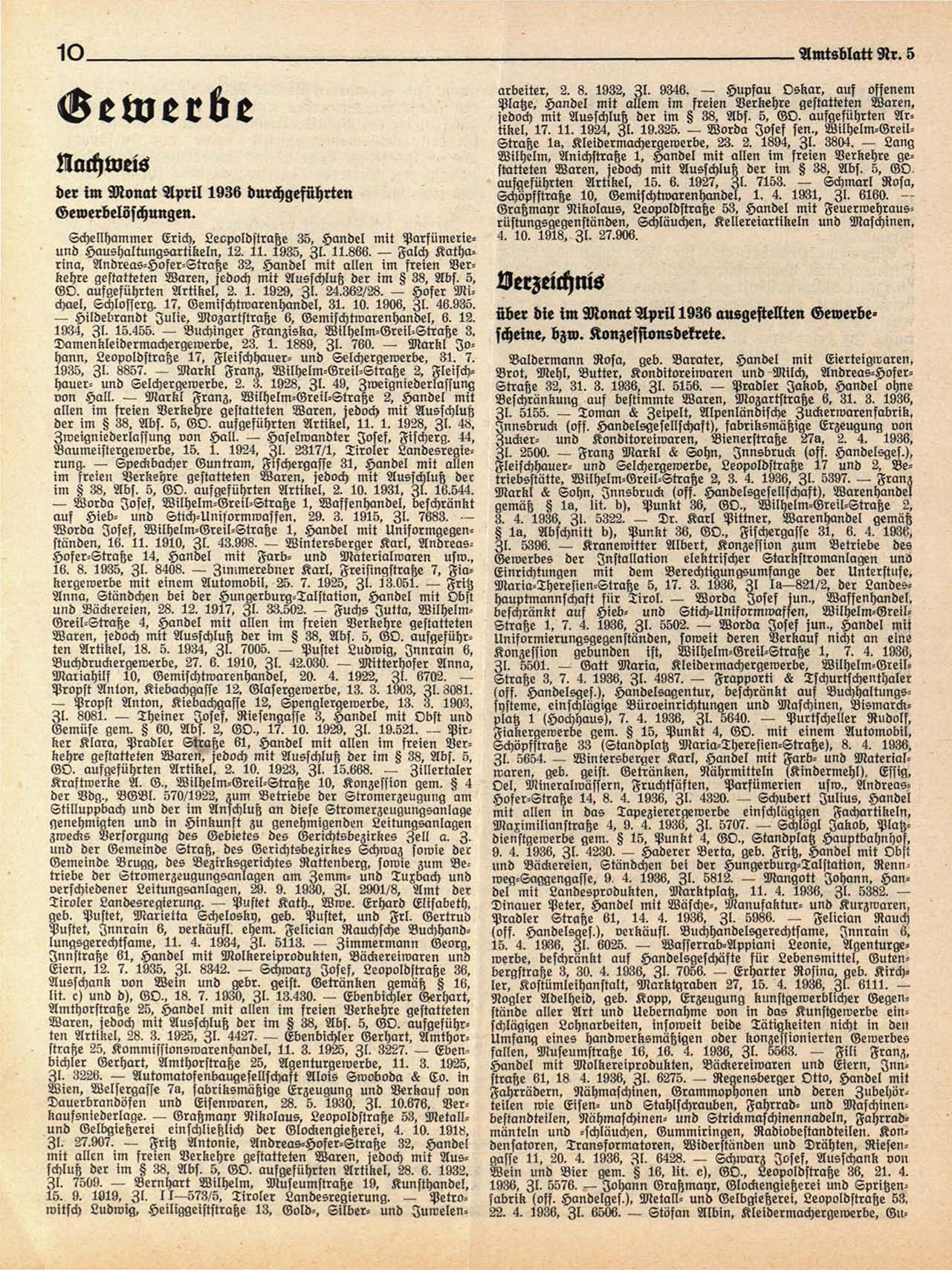 Zl. 5501. — Gatt Maria, Kleidermachergewerbe, Wilhelm-GreilStraße 3. 7. 4. 1936. Zl. 4987. — Frapparti H Tschurtschenthaler