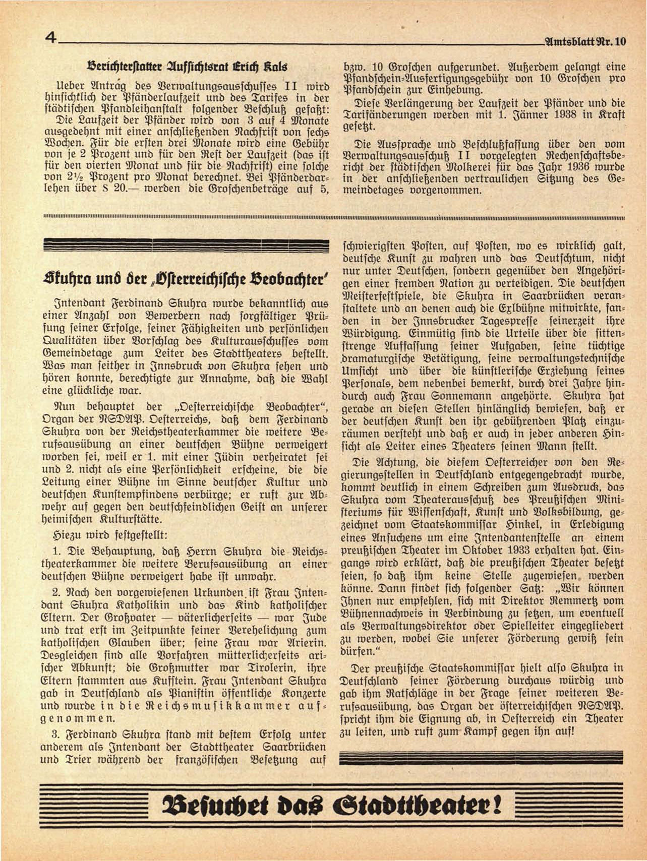 Meisterfestspiele, die Skuhra in Saarbrücken veranIntendant Ferdinand Skuhra wurde bekanntlich aus staltete und an denen auch die Exlbühne mitwirkte, faneiner Anzahl von Bewerbern nach sorgfältiger Prü- den in der Innsbrucker Tagespresse seinerzeit ihre