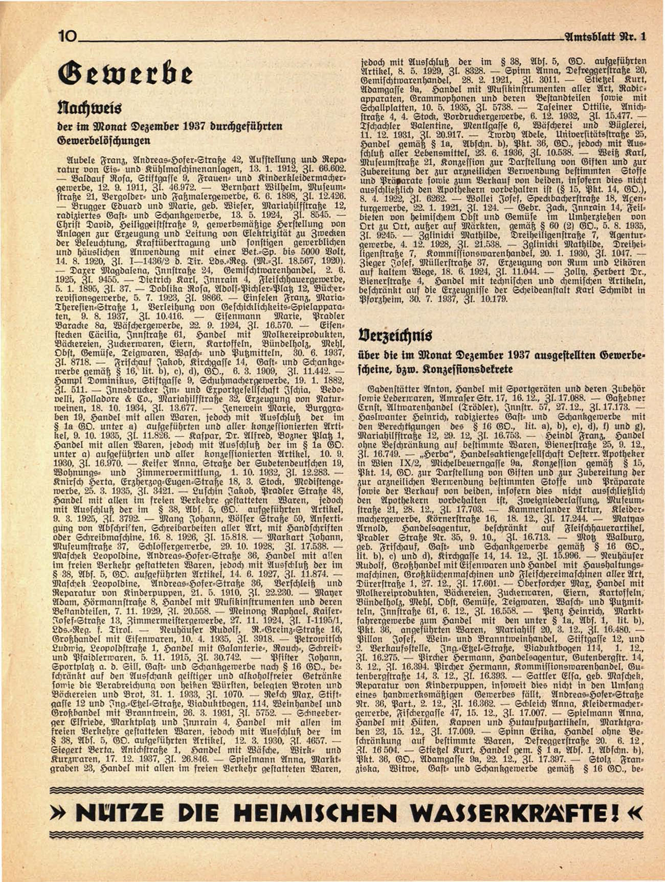 über die im Monat Dezember 1937 ausgestellten Gewerbescheine, bzw. Konzesfionsdekrete