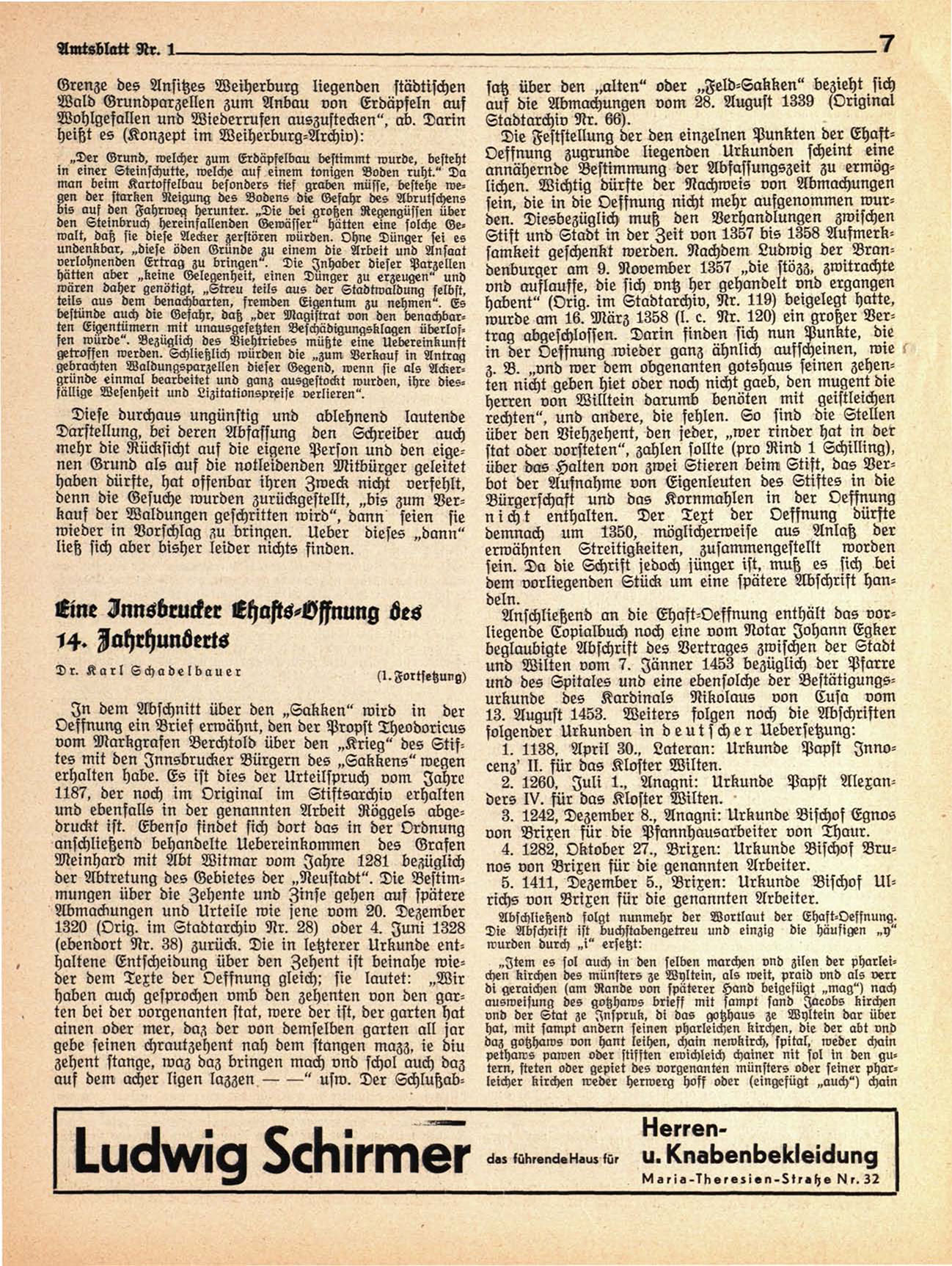 vom Markgrafen Berchtold über den „Krieg" des Stiftes mit den Innsbrucker Bürgern des „Sakkens" wegen