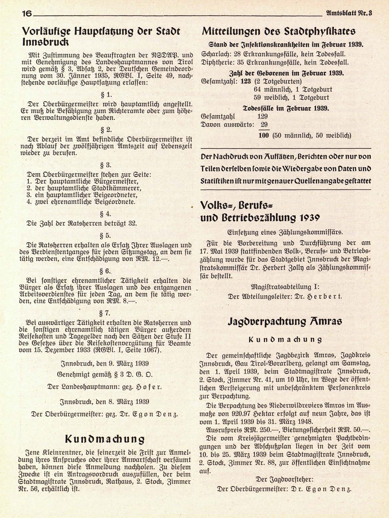 17. Mai 1939 stattfindenden Volk-, Berufs- und Vetriebszählung wurde für das Stadtgebiet Innsbruck der Magistratskommissär Dr. Herbert Jolly als Zählungskommissär bestellt.