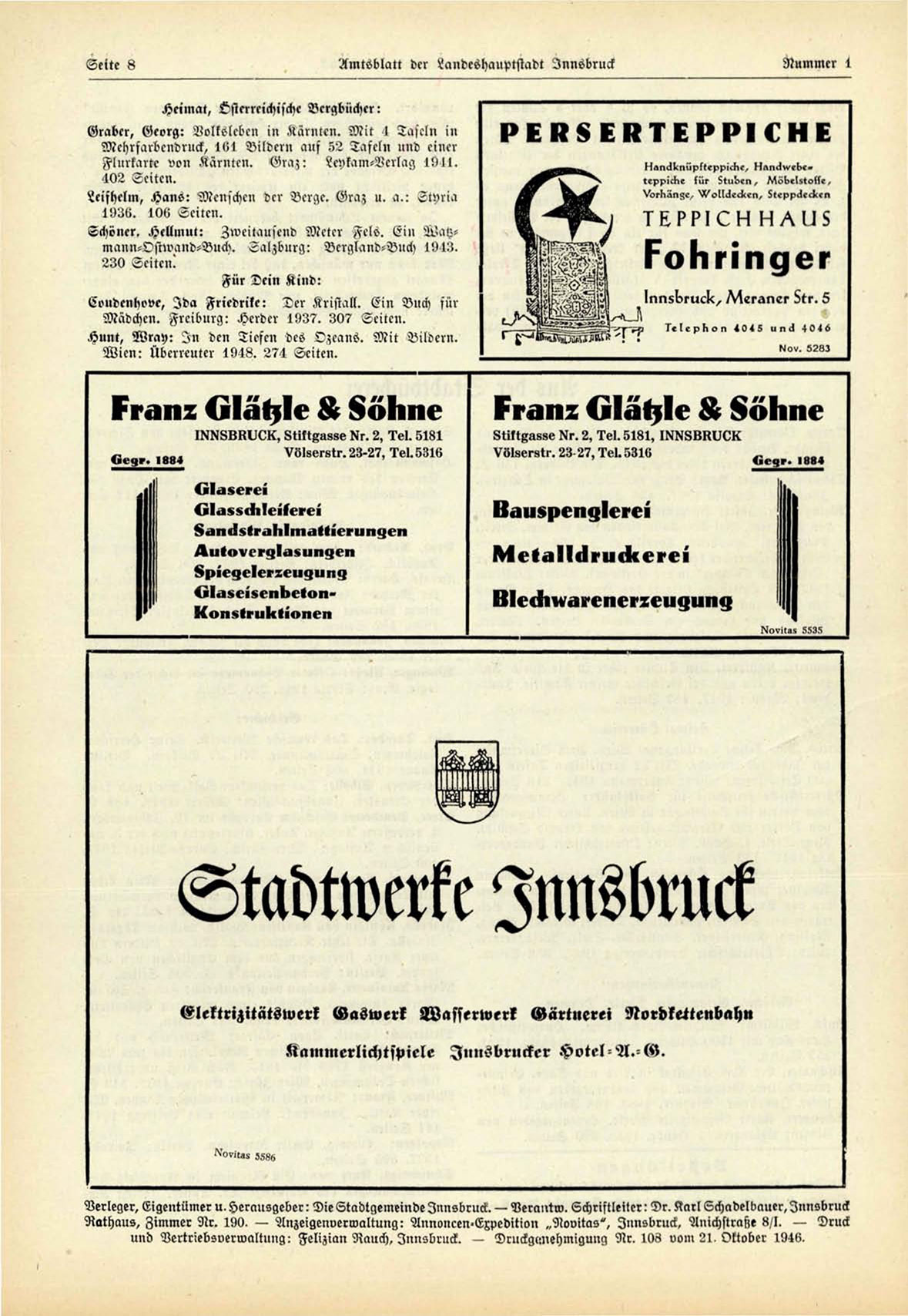 und Vertriebsverwaltung: Felizian Nauch, Innsbruck. — Druckgcmehmigung Nr. 108 uom 2 l. Ottober 1946.