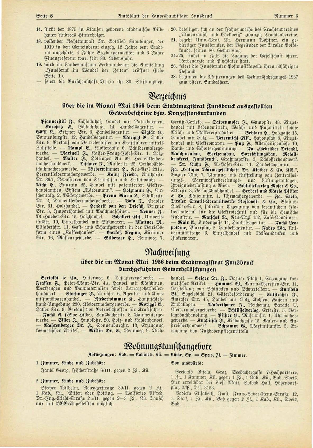 über die im Monat M a i 1956 beim Stadtmagistrat Innsbruck ausgestellten
