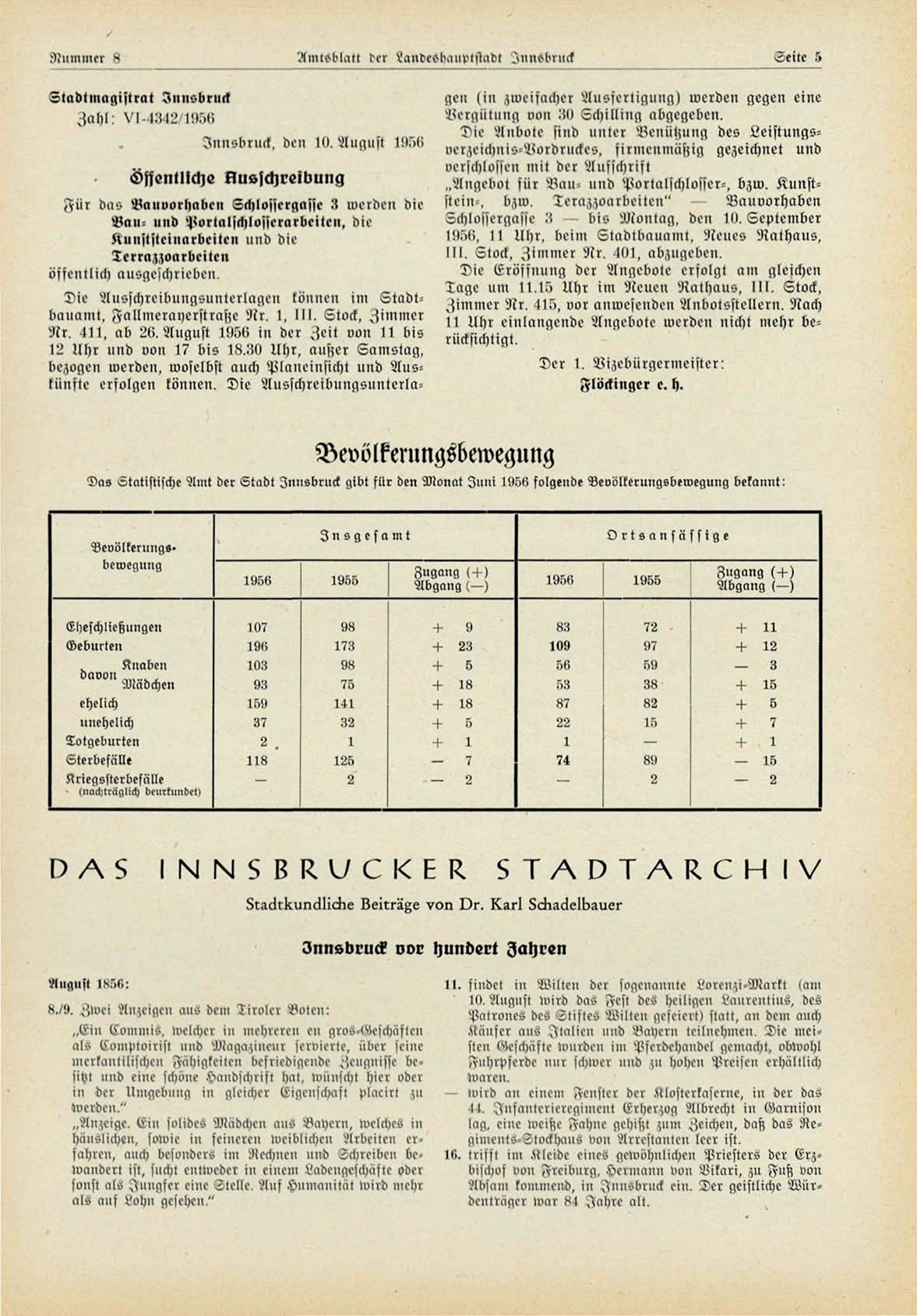 Das Statistische Amt der Stadt Innsbruck gibt für den Monat Inni 1956 folgende Bevölkerungsbewegung bekannt-