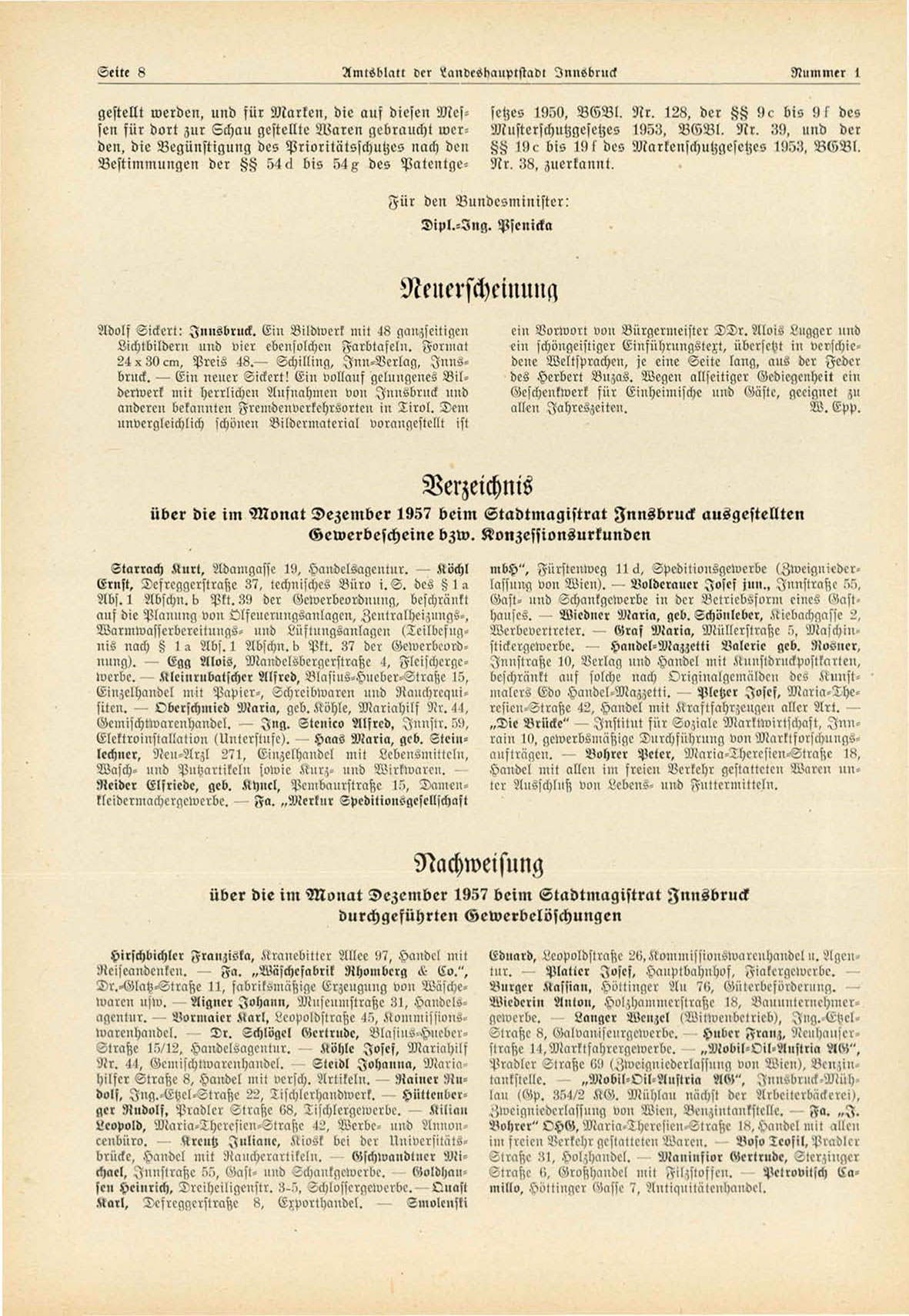 über die im Monat Dezember 1957 beim Stadtmagistrat Innsbruck ausgestellten