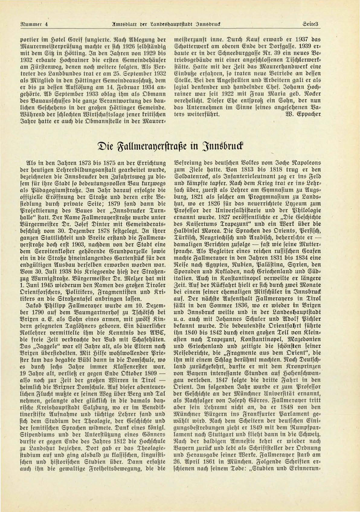 Projektierung des Baues der „Innsbrucker Turnhalle" statt. Der Name Fallmerayerftraße wurde unter