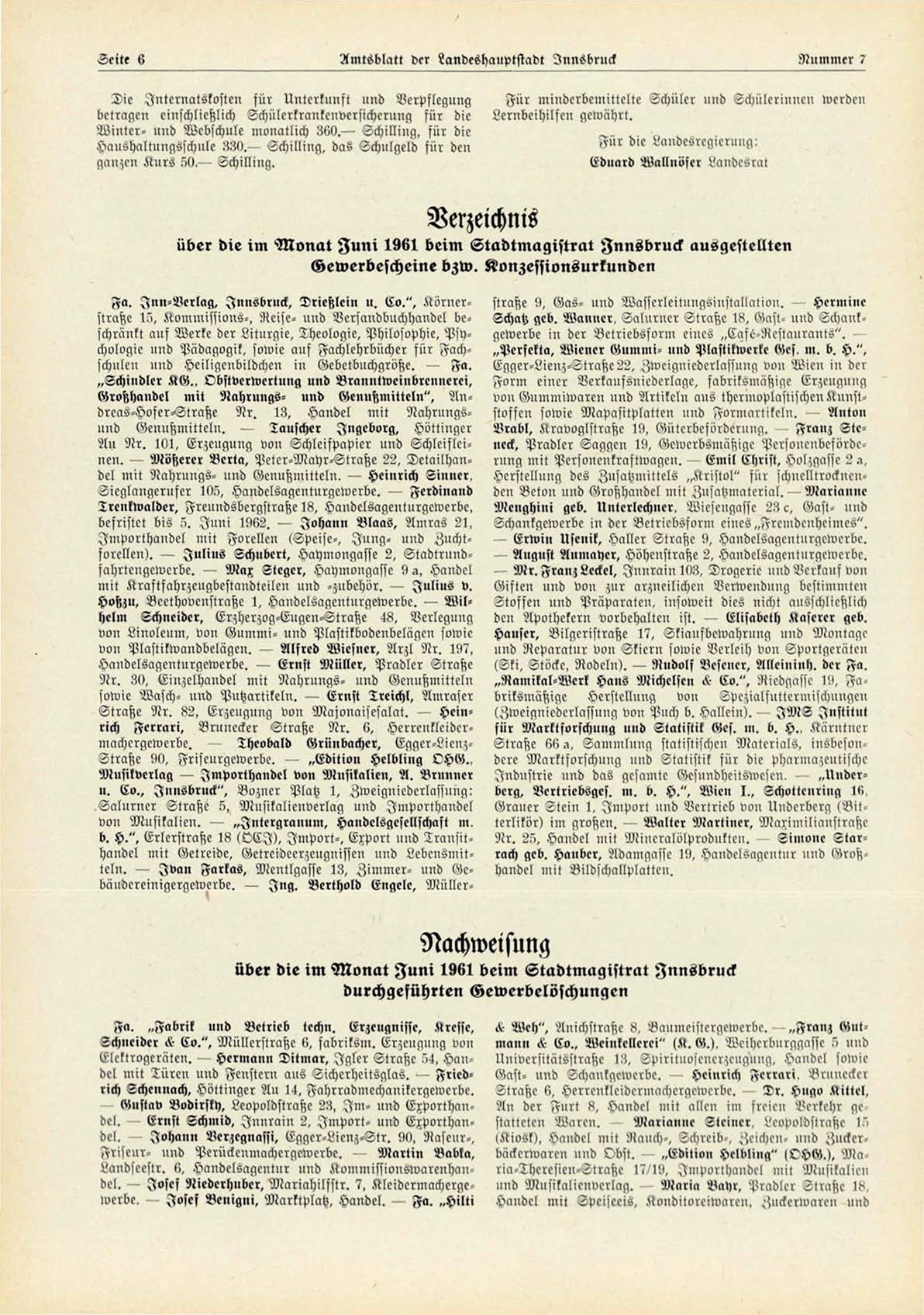 über die im Monat J u n i 1961 beim Stadtmagistrat Innsbruck ausgestellten