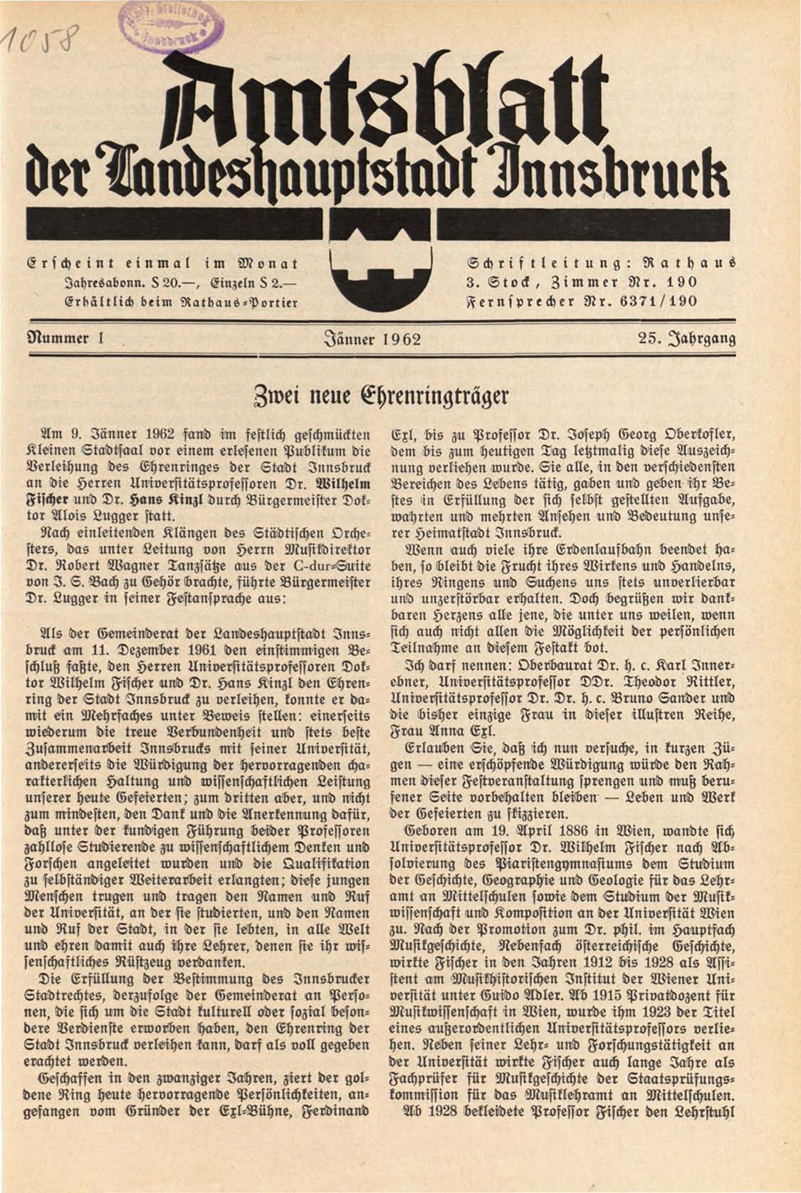 wirkte Fischer in den Jahren 1912 bis 1928 als AssiDie Erfüllung der Bestimmung des Innsbrucker stent am Musikhistoiischen Institut der Wiener UniStadtrechtes, derzufolge der Gemeinderat an Perso- versität unter Guido Adler. Ab 1915 Privatdozent für