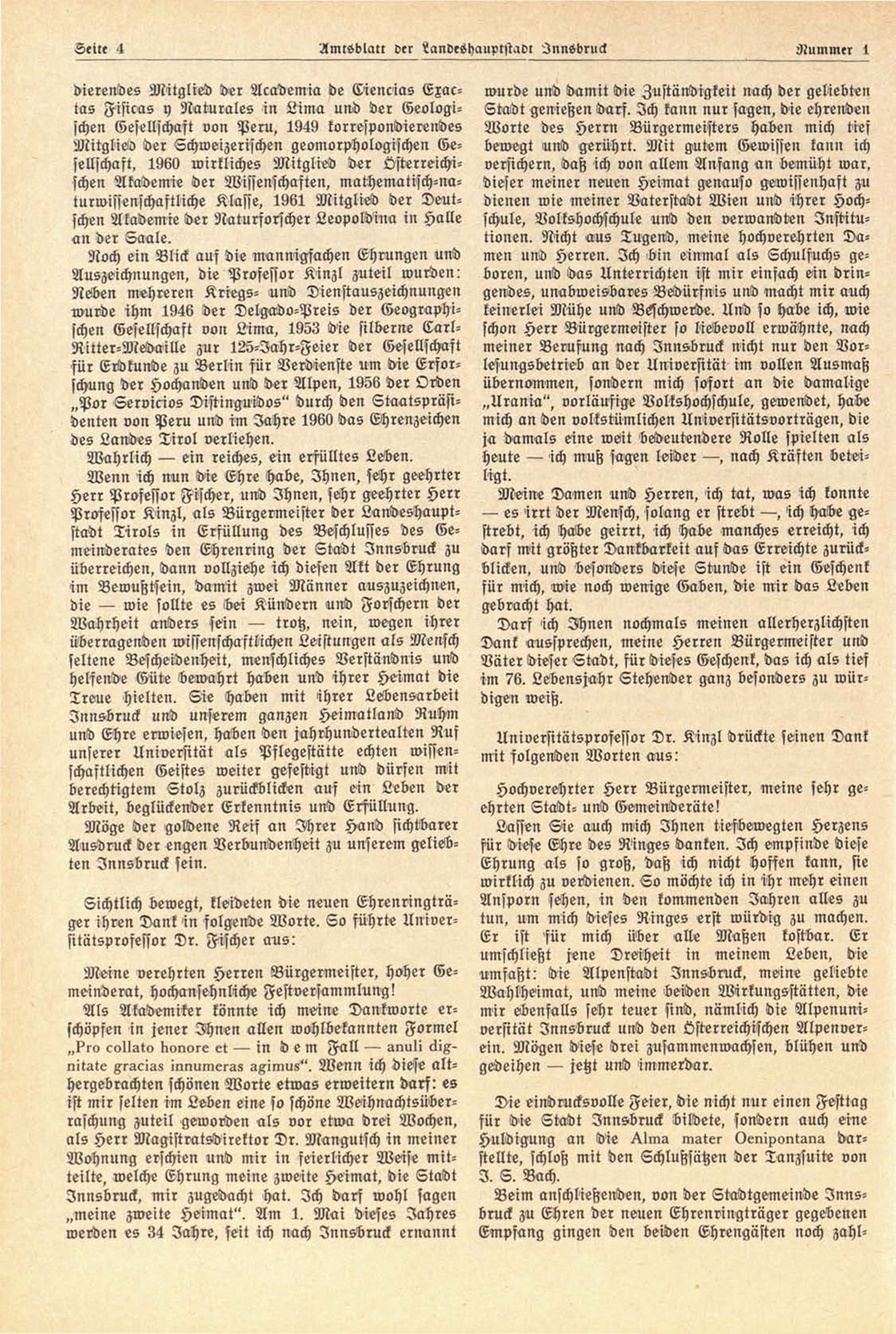 Professor Kinzl, als Bürgermeister der Landeshauptstadt Tirols in Erfüllung des Beschlusses des Gemeinderates den Ehrenring der Stadt Innsbruck zu