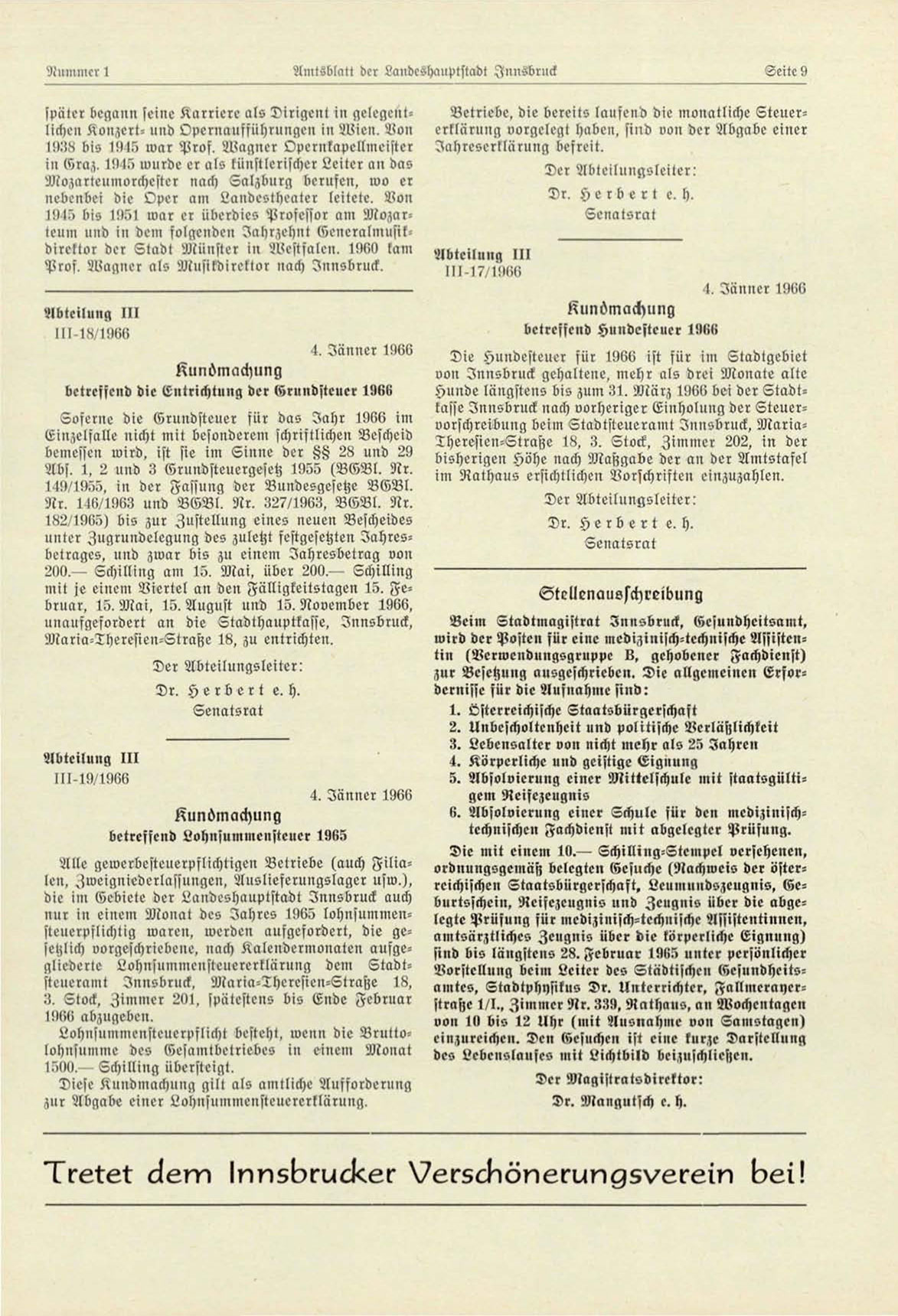 Hunde längstens bis zum 31. Ntärz 1966 bei der Stadttasse Innsbruck nach vorheriger Einholung der Steueruorschreibung beim Stadtsteueramt Innsbruck, M a r i a Theresien-Ttraße 18, 3. Stock, Zimmer 202, i n der