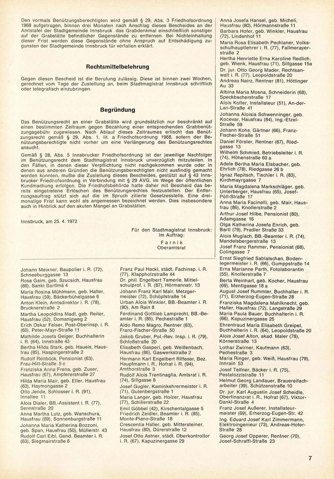 w e r d e n k o n n t e n , mußte d i e Z u s t e l l u n g d i e s e s B e s c h e i d e s , gestützt auf § 43 Innsb r u c k e r F r i e d h o f s o r d n u n g in V e r b i n d u n g m i t § 2 9 A V G , i m W e g e d e r ö f f e n t l i c h e n