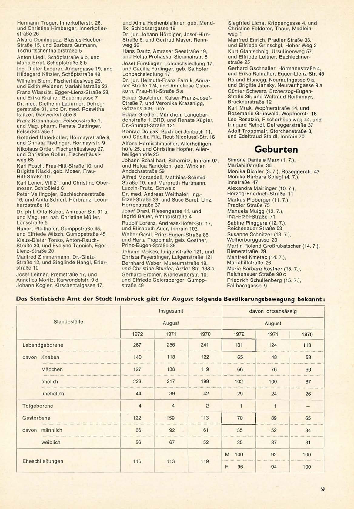 Das Statistische Amt der Stadt Innsbruck gibt für August folgende Bevölkerungsbewegung bekannt: