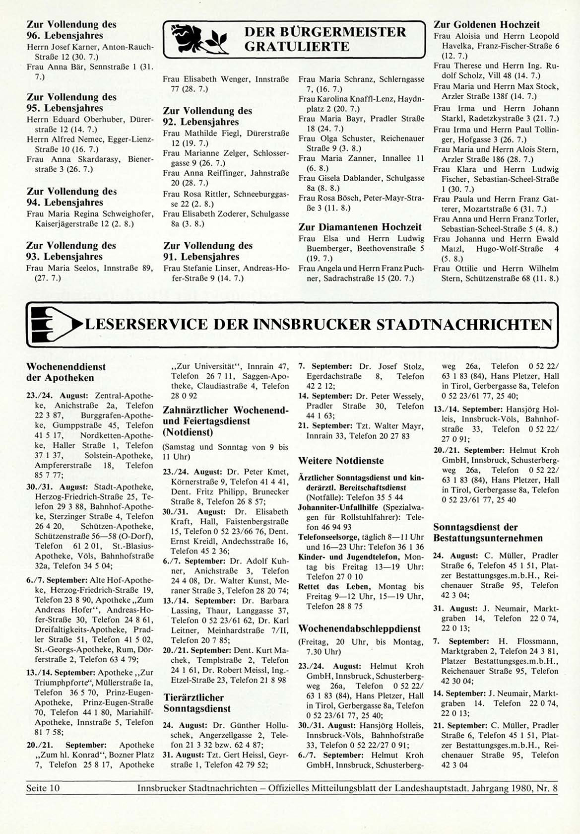Innsbrucker Stadtnachrichten — Offizielles Mitteilungsblatt der Landeshauptstadt. Jahrgang 1980, N r . 8