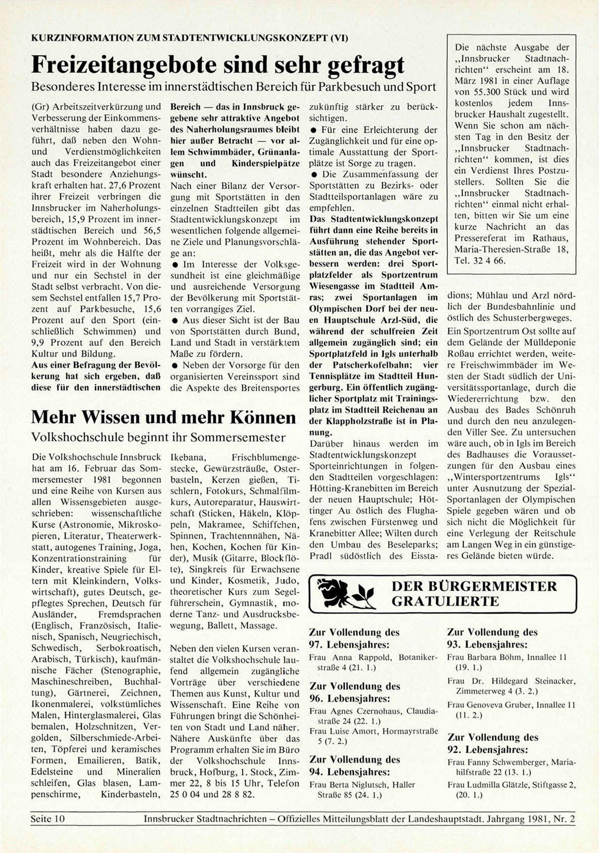 Innsbrucker Stadtnachrichten — Offizielles Mitteilungsblatt der Landeshauptstadt. Jahrgang 1981, Nr. 2