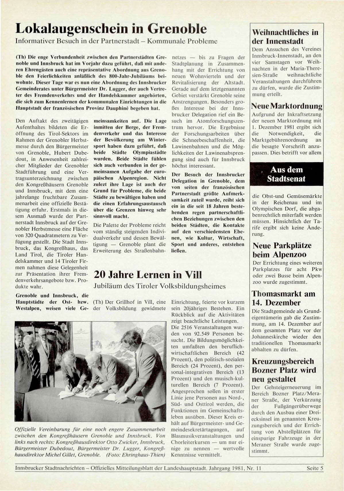 jahrelange fruchtbare Zusammenarbeit eine offizielle Bestätigung erfuhr. Erstmals in diesem Ausmaß wurde der Partnerstadt Innsbruck auf der Grenobler Herbstmesse eine Fläche