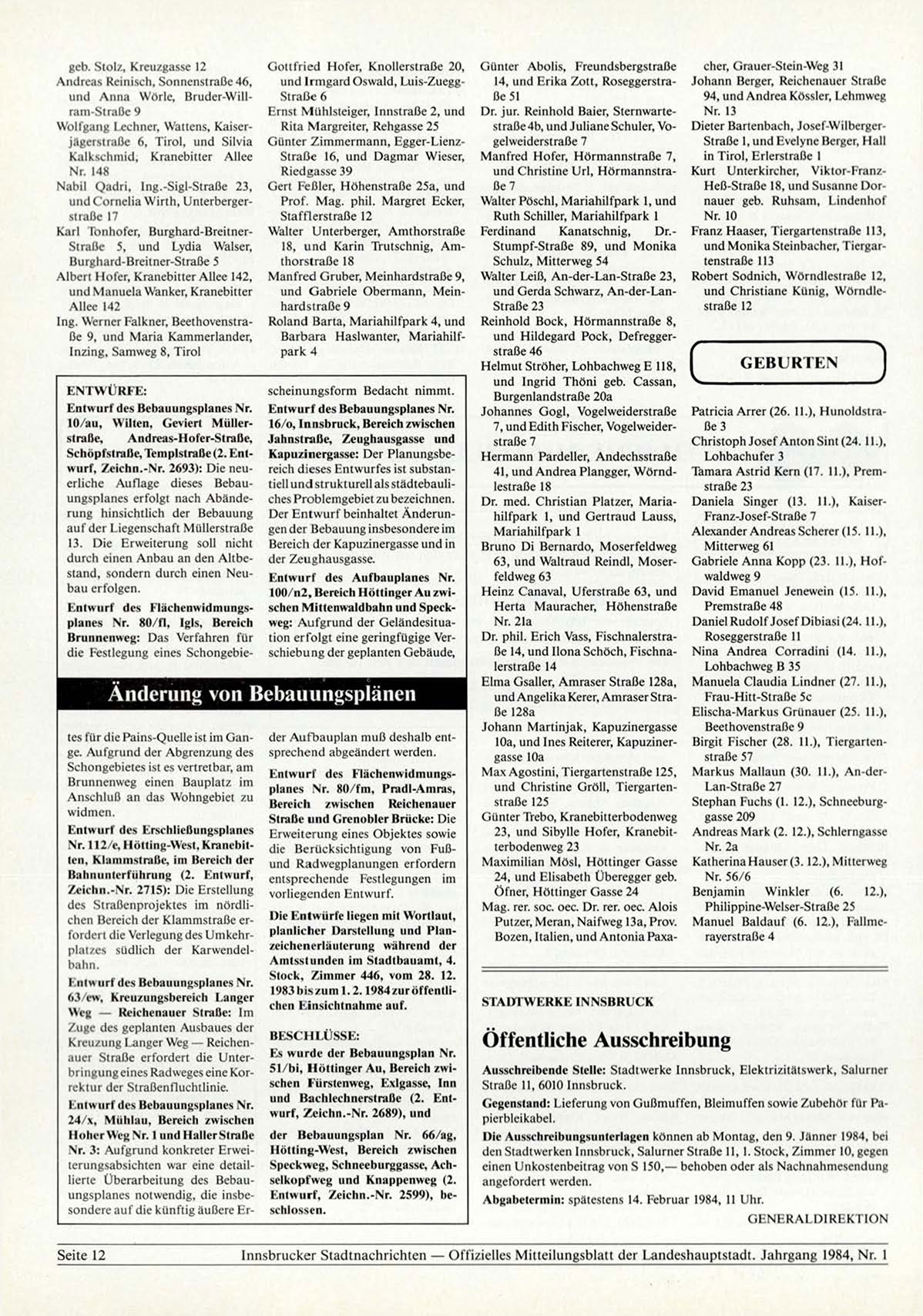Innsbrucker Stadtnachrichten — Offizielles Mitteilungsblatt der Landeshauptstadt. Jahrgang 1984, Nr. 1