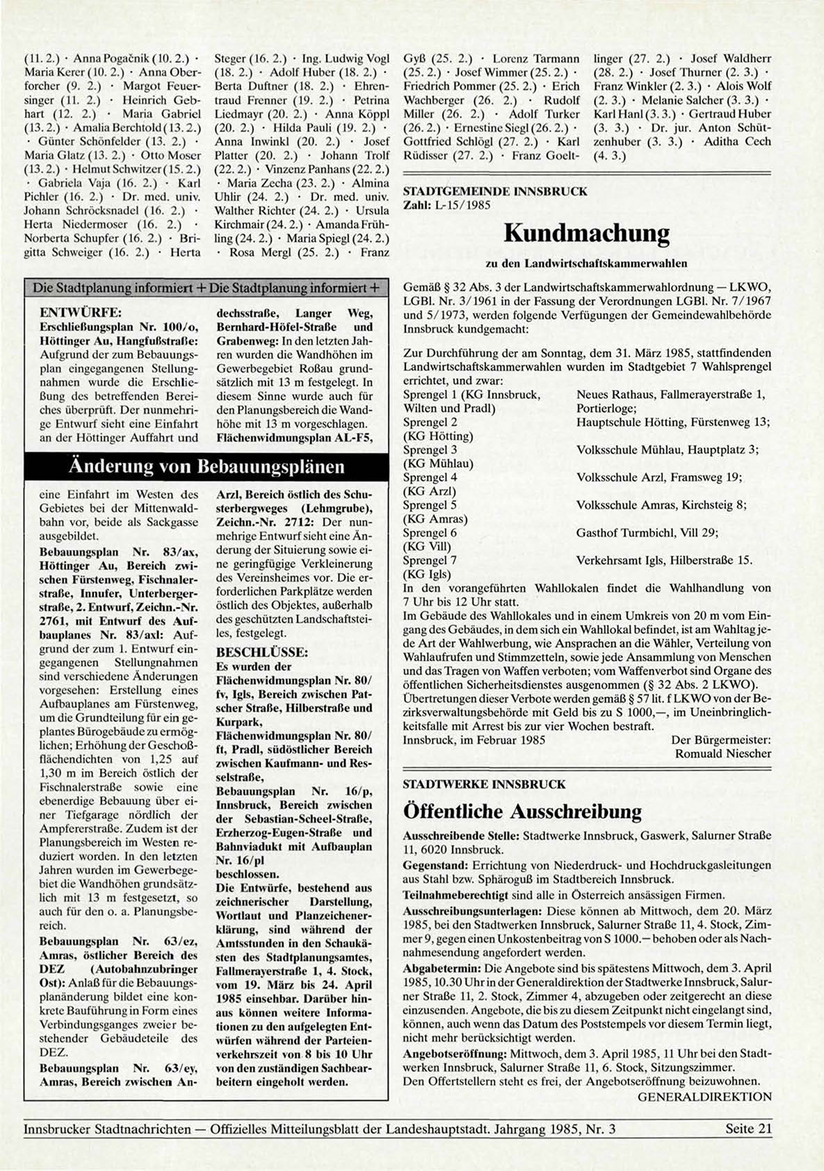 1985, bei den Stadtwerken Innsbruck, Salurner Straße 11, 4. Stock, Zimmer 9, gegen einen Unkostenbeitrag von S 1000.— behoben oder als Nachnahmesendung angefordert werden.