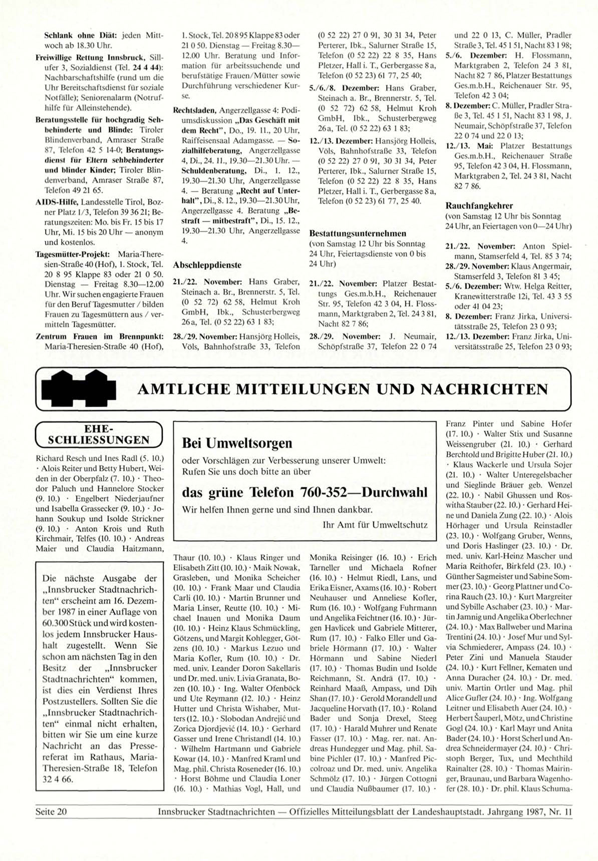 Innsbrucker Stadtnachrichten — Offizielles Mitteilungsblatt der Landeshauptstadt. Jahrgang 1987, Nr. 11