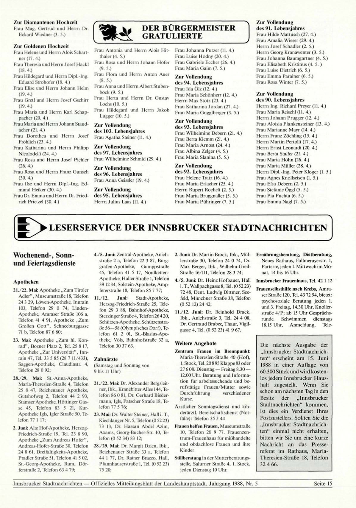 Innsbrucker Stadtnachrichten — Offizielles Mitteilungsblatt der Landeshauptstadt. Jahrgang 1988, Nr. 5
