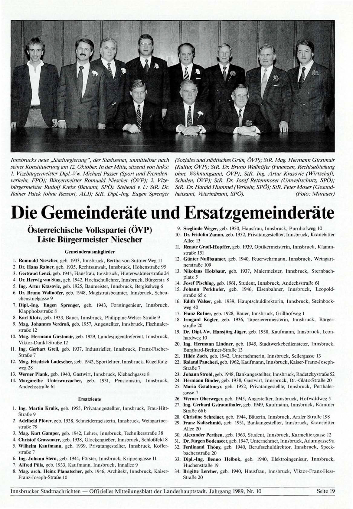 Innsbrucker Stadtnachrichten — Offizielles Mitteilungsblatt der Landeshauptstadt. Jahrgang 1989, Nr. 10