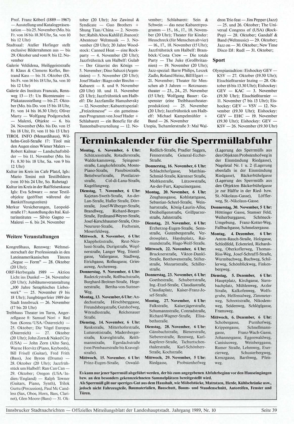 Innsbrucker Stadtnachrichten — Offizielles Mitteilungsblatt der Landeshauptstadt. Jahrgang 1989, Nr. 10
