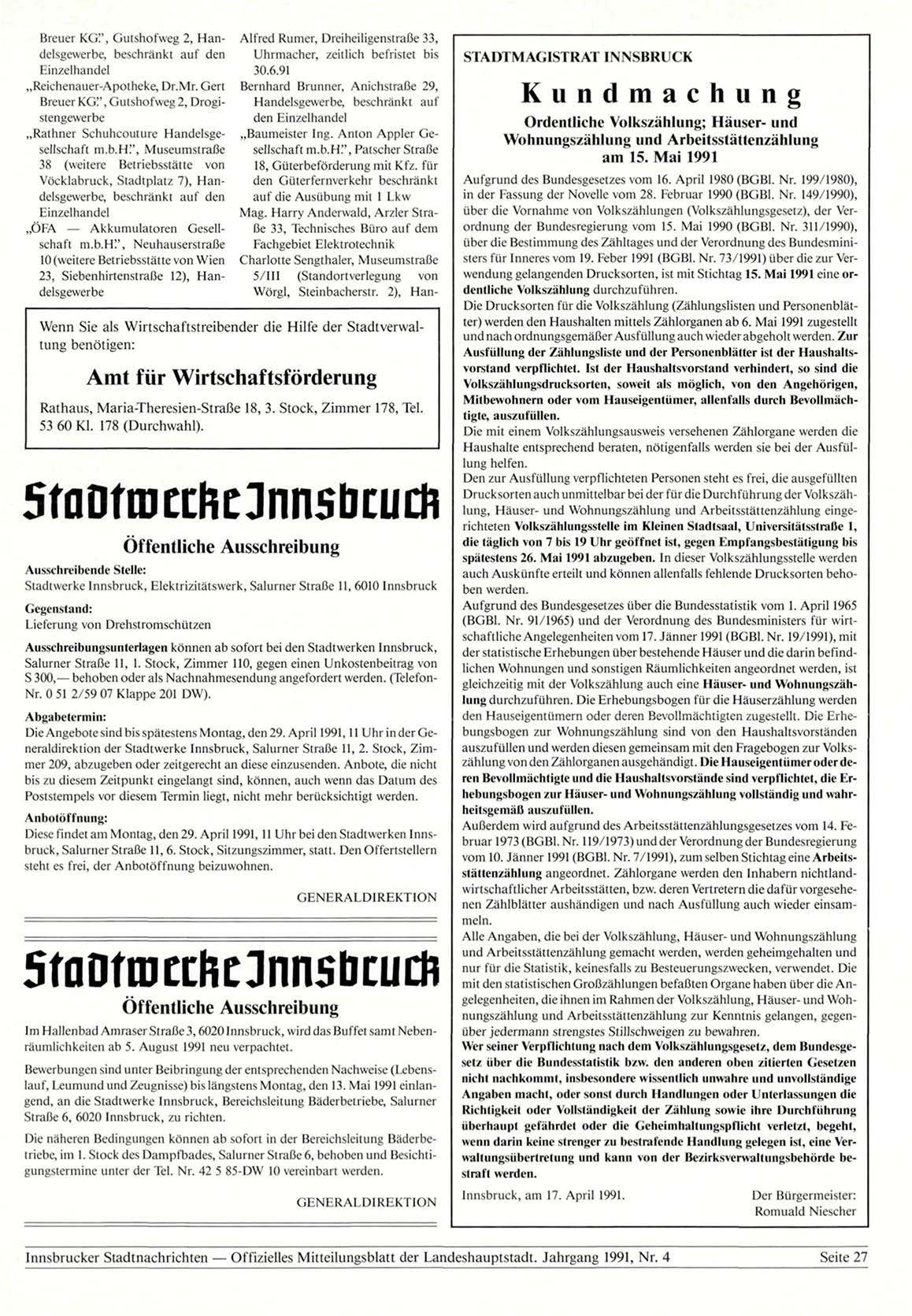 Innsbrucker Stadtnachrichten — Offizielles Mitteilungsblatt der Landeshauptstadt. Jahrgang 1991, Nr. 4