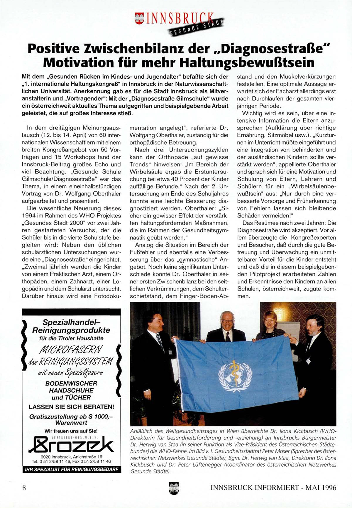 „1. internationale Haltungskongreß" in Innsbruck in der Naturwissenschaftlichen Universität. Anerkennung gab es für die Stadt Innsbruck als Mitveranstalterin und „Vortragender": Mit der „Diagnosestraße Gilmschule" wurde