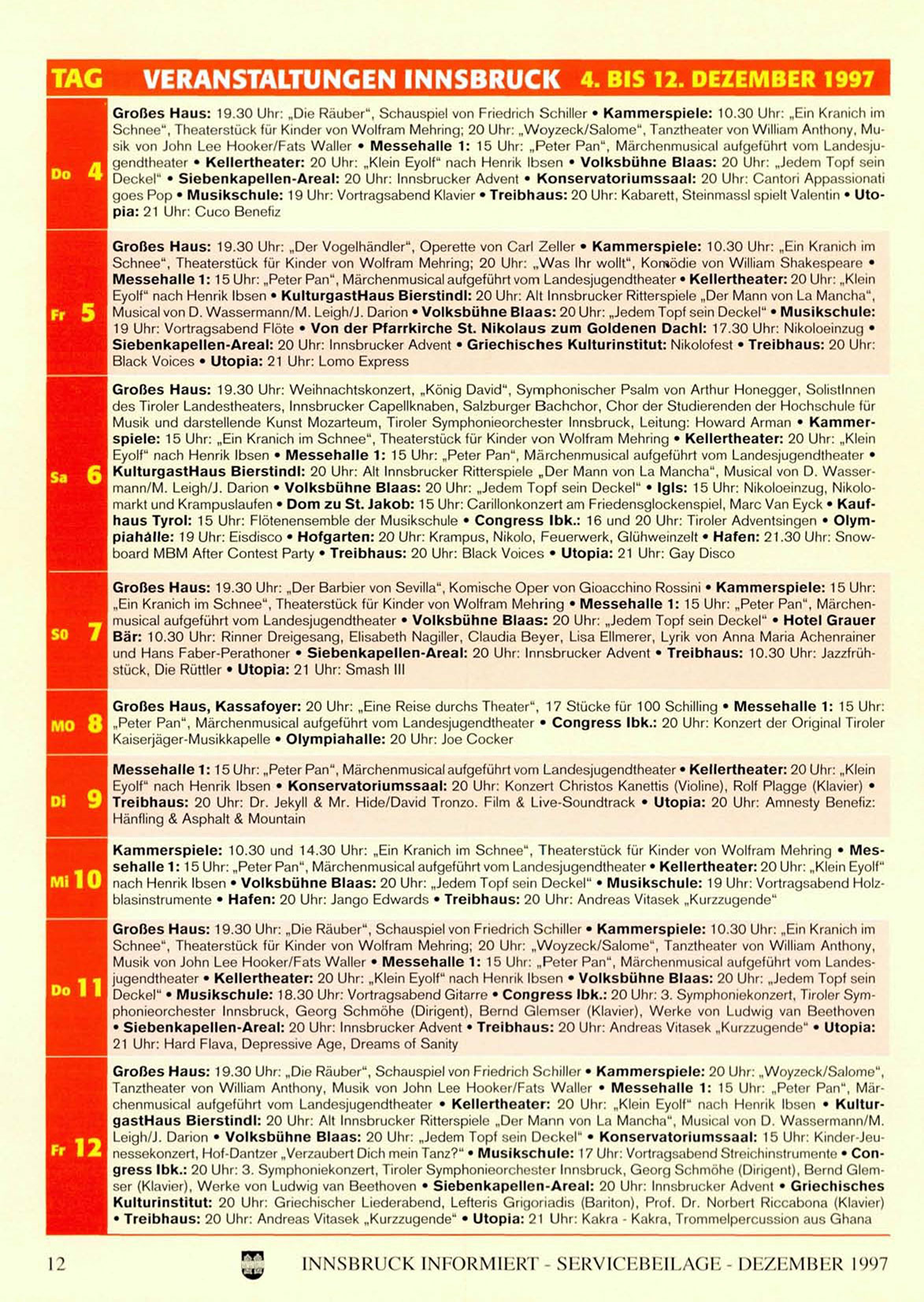 und Hans Faber-Perathoner • Siebenkapellen-Areal: 20 Uhr: Innsbrucker Advent • Treibhaus: 10.30 Uhr: Jazzfrühstück, Die Rüttler • Utopia: 21 Uhr: Smash III
