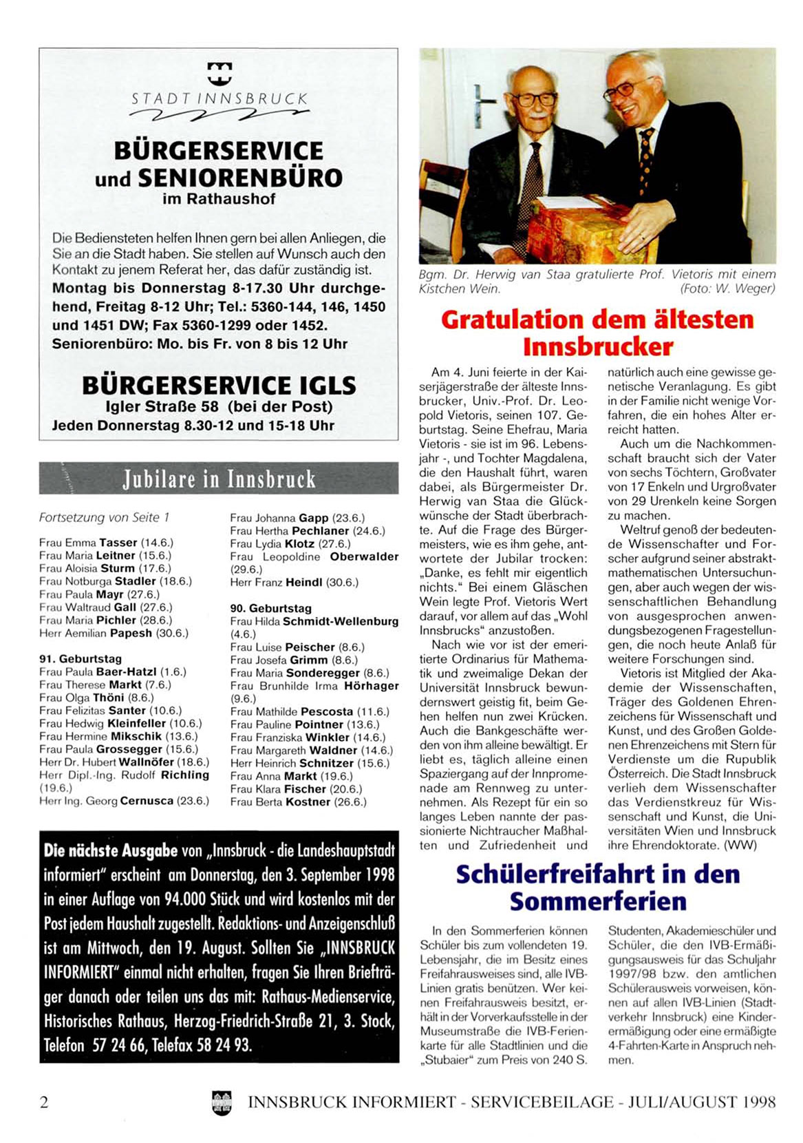 Am 4. Juni feierte in der Kaiserjägerstraße der älteste Innsbrucker, Univ.-Prof. Dr. Leopold Vietoris, seinen 107. Geburtstag. Seine Ehefrau, Maria