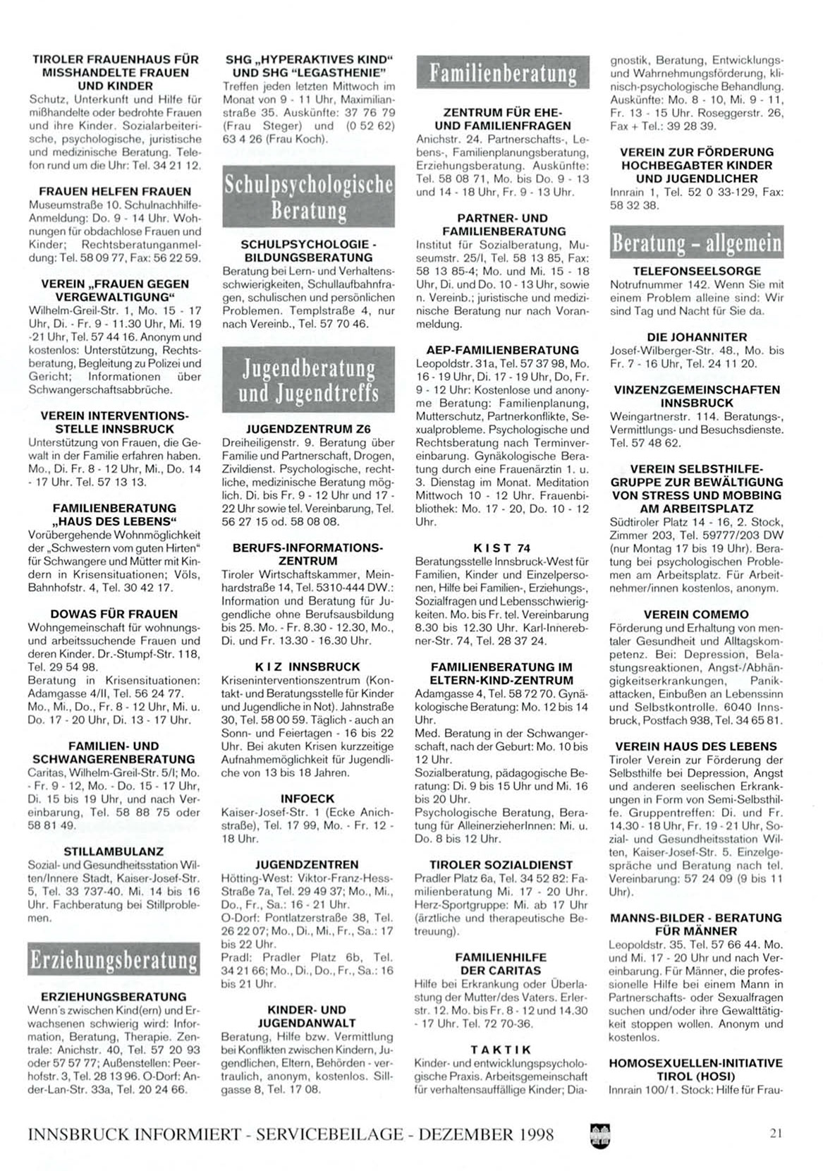 Wenns zwischen Kind(ern) und Erwachsenen schwierig wird: Information, Beratung, Therapie. Zentrale: Anichstr. 40, Tel. 57 20 93
