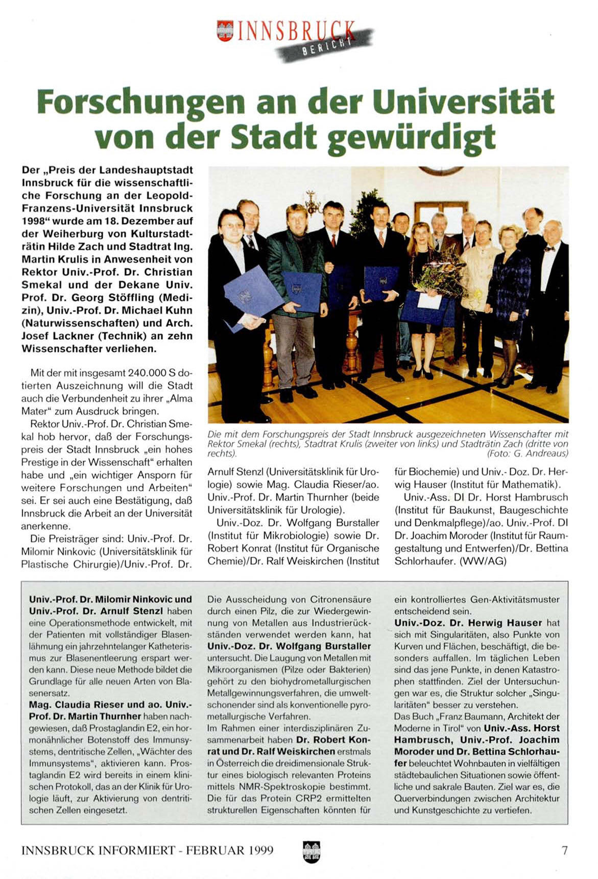 Rektor Univ.-Prof. Dr. Christian Smekal hob hervor, daß der Forschungspreis der Stadt Innsbruck „ein hohes