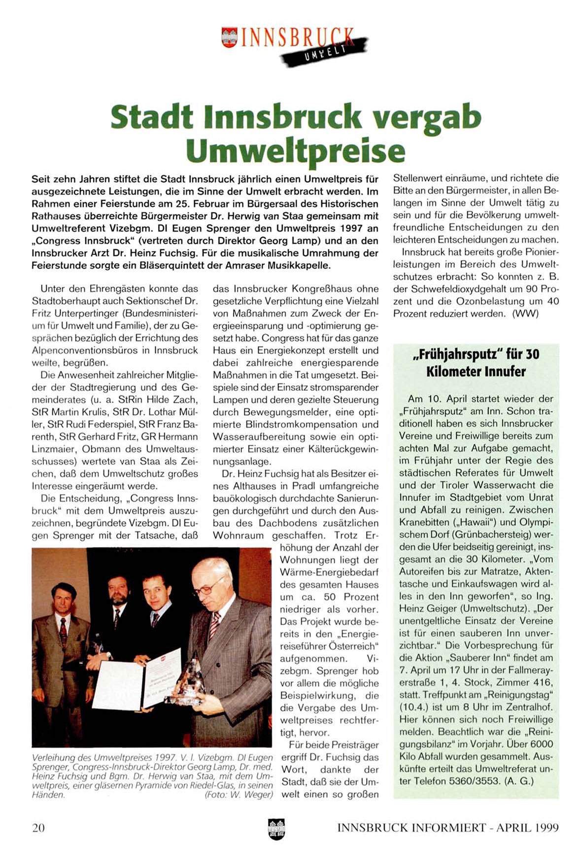 Die Entscheidung, „Congress Innsbruck" mit dem Umweltpreis auszuzeichnen, begründete Vizebgm. DI Eugen Sprenger mit der Tatsache, daß