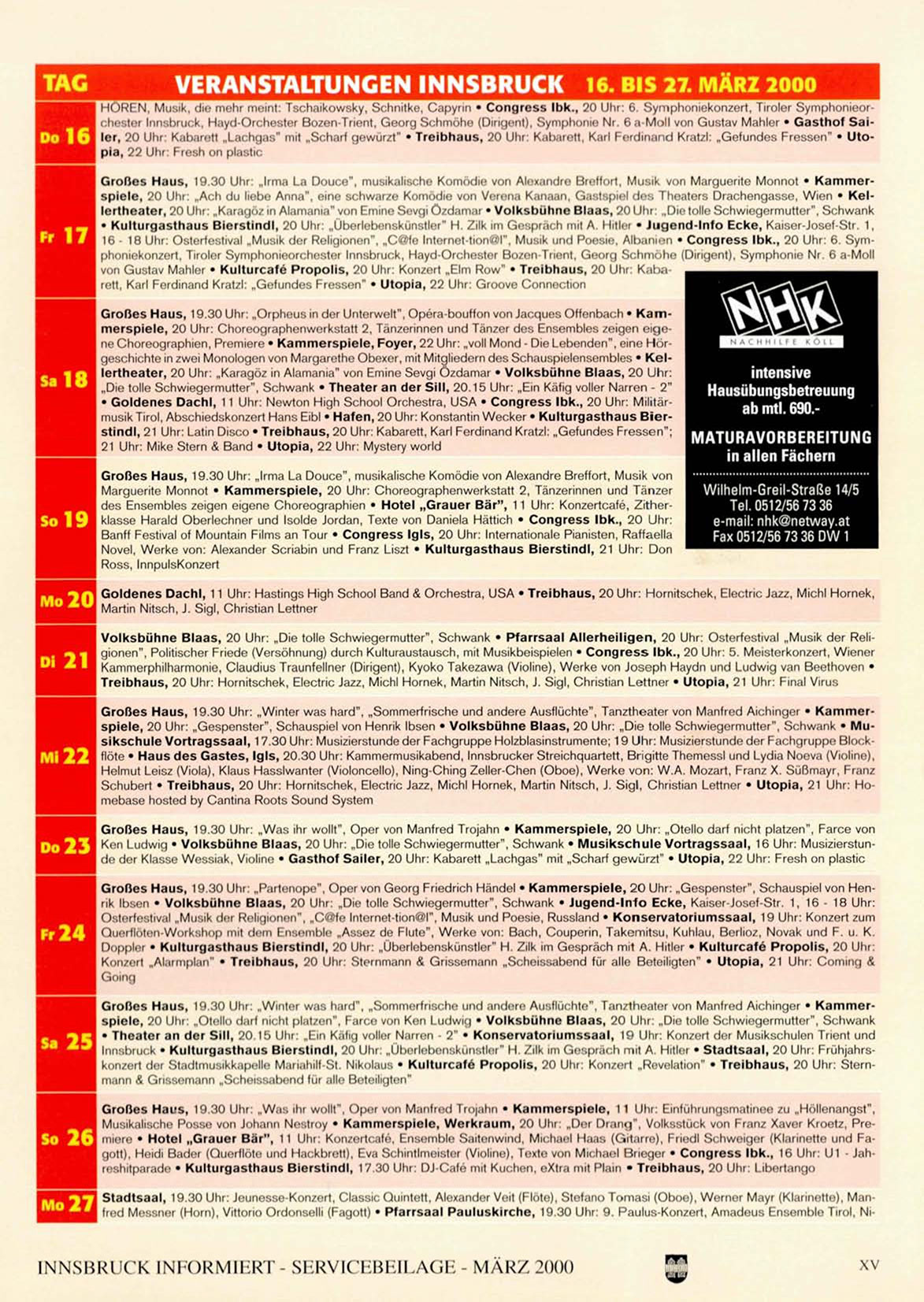 Innsbruck • K u l t u r g a s t h a u s B i e r s t i n d l , 20 Uhr: „Ulierlebenskunstler" 11. /ilk im Gespräch mit A. Hitler • S t a d t s a a l , 20 Uhr: Frühjahrskonzert der Stadtinusikkapelle Mariahilf St. Nikolaus • K u l t u r c a f e P r o p o l i s , 20 Uhr: Konzert „Révélation" • T r e i b h a u s , 20 Uhr: Sternmann & Grisseniann „Scheissabend fur alle Beteiligten"