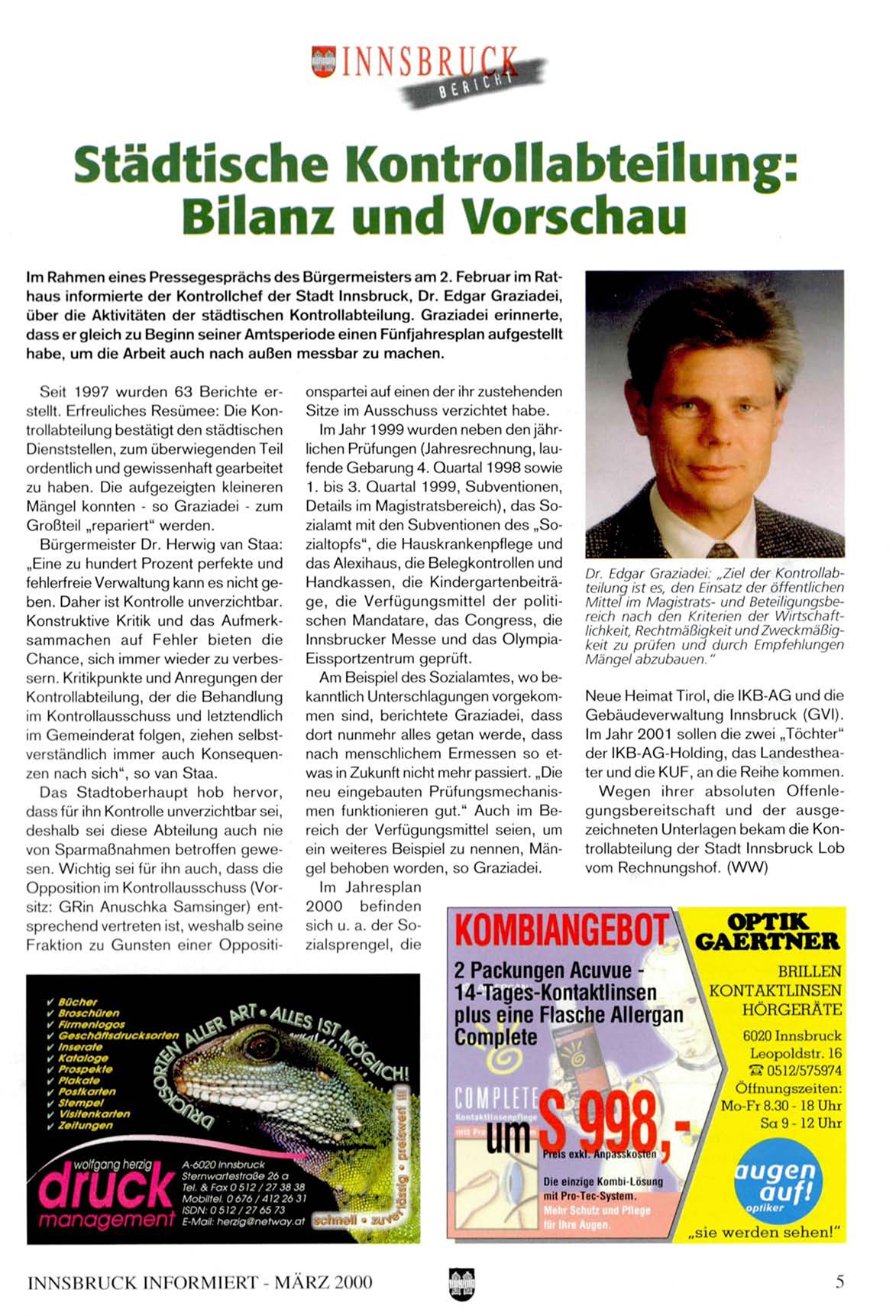 Im R a h m e n e i n e s P r e s s e g e s p r ä c h s d e s B ü r g e r m e i s t e r s a m 2. Februar im Rath a u s i n f o r m i e r t e der K o n t r o l l c h e f der S t a d t I n n s b r u c k , Dr. Edgar G r a z i a d e i ,