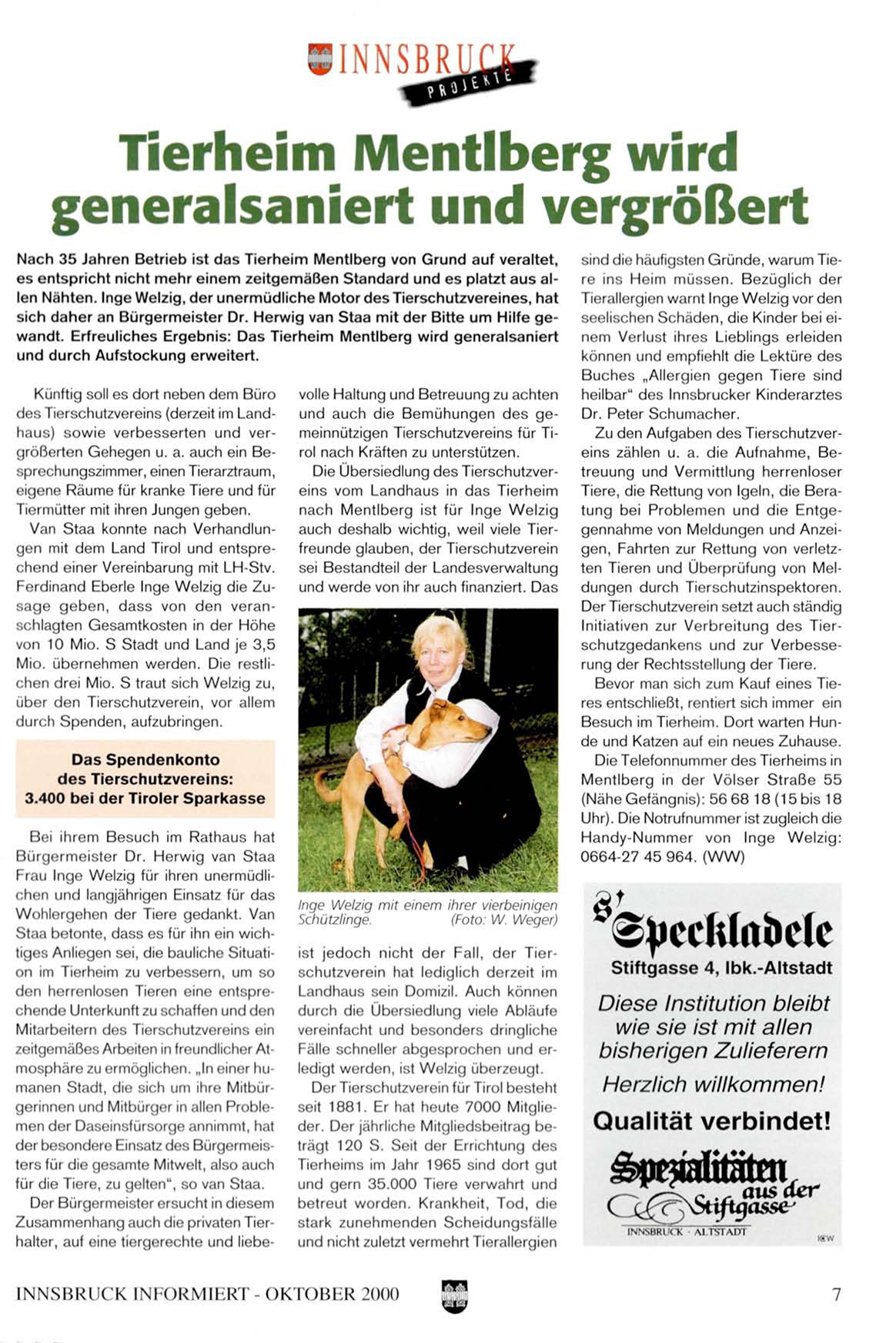 s i c h d a h e r an B ü r g e r m e i s t e r Dr. H e r w i g van Staa m i t der B i t t e u m Hilfe g e wandt. Erfreuliches Ergebnis: Das Tierheim Mentlberg wird generalsaniert