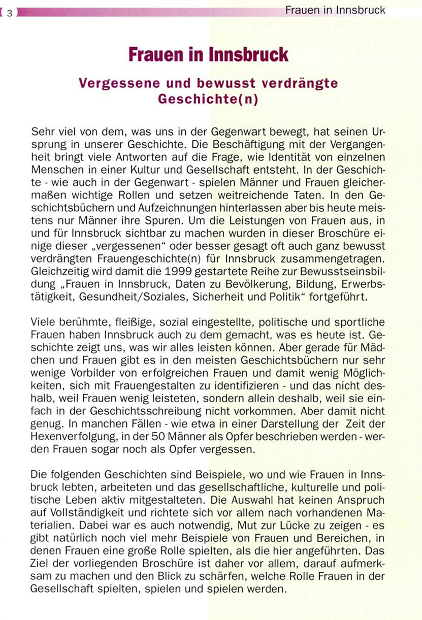 Gleichzeitig wird damit die 1999 gestartete Reihe zur Bewusstseinsbildung „Frauen in Innsbruck, Daten zu Bevölkerung, Bildung, Erwerbstätigkeit, Gesundheit/Soziales, Sicherheit und Politik" fortgeführt.