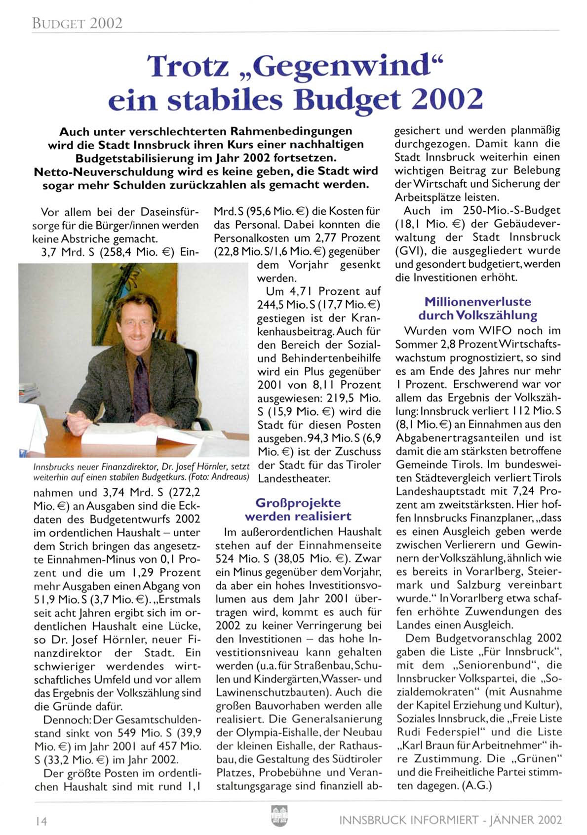 den Investitionen - das hohe Inso Dr. Josef Hörnler, neuer Finanzdirektor der Stadt. Ein vestitionsniveau kann gehalten gaben die Liste „Für Innsbruck",