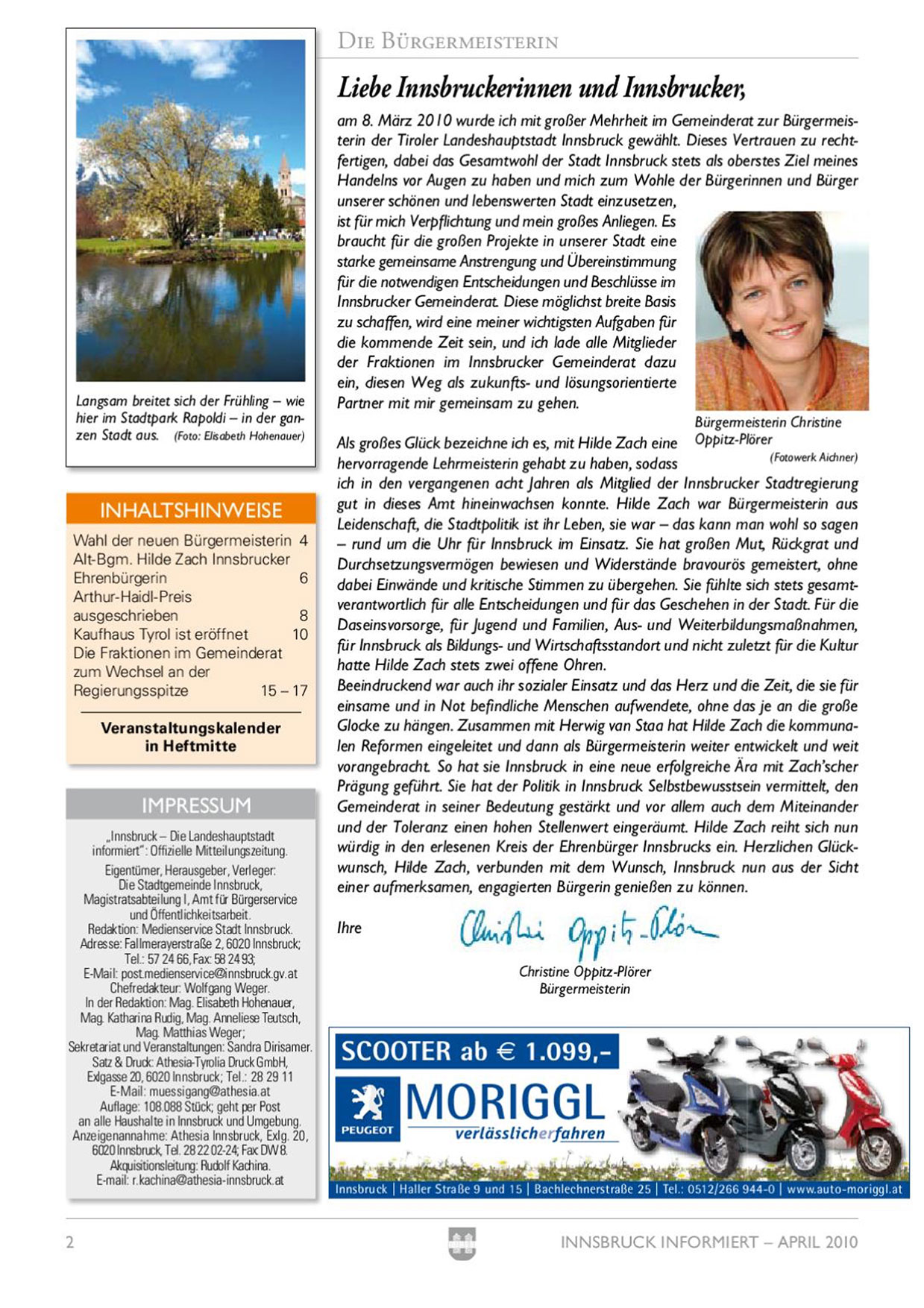 am 8. März 20 1O wurde ich mit großer Mehrheit im Gereinderat zur Bürgermeisterin der Tiroler Landeshauptstadt Innsbruck gewählt. Dieses Vertrauen zu rechtfertigen, dabei das Gesamtwohl der Stadt Innsbruck stets als oberstes Ziel meines Handelns vor Augen zu haben und mich zum Wohle der Bürgerinnen