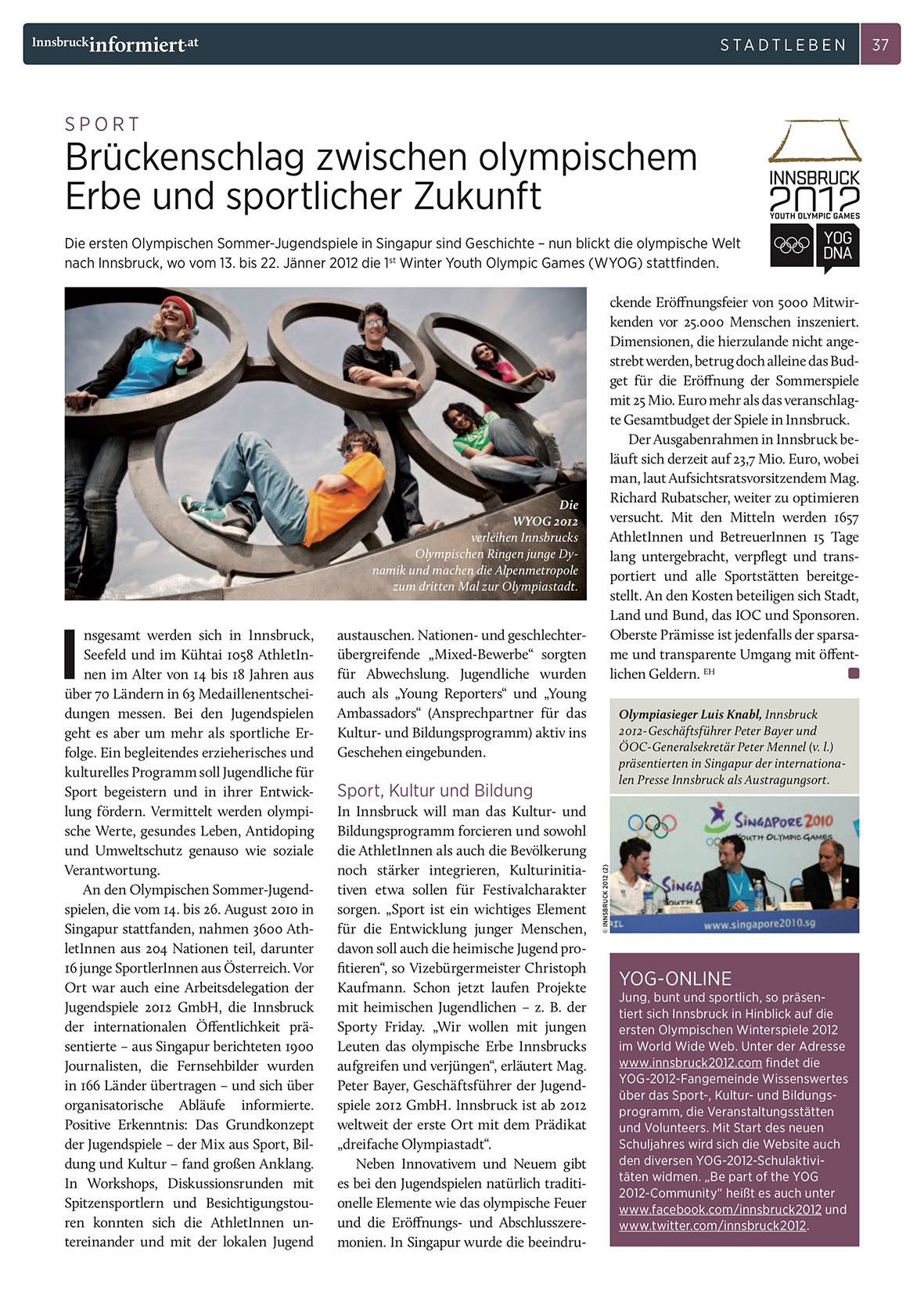 nach Innsbruck, wo vom 13. bis 22. Jänner 2012 die 1st Winter Youth Olympic Games (WYOG) stattfinden.