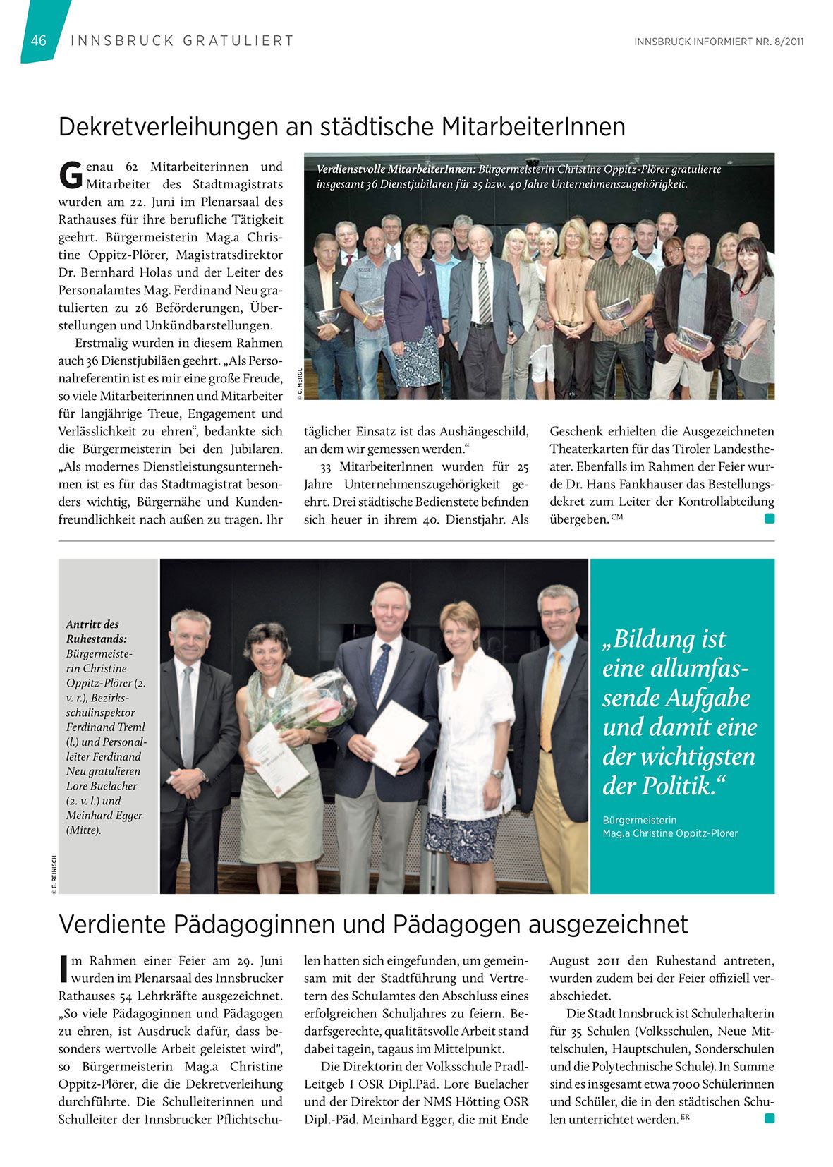 Verdienstvolle MitarbeiterInnen: Bürgermeisterin Christine Oppitz-Plörer gratulierte
